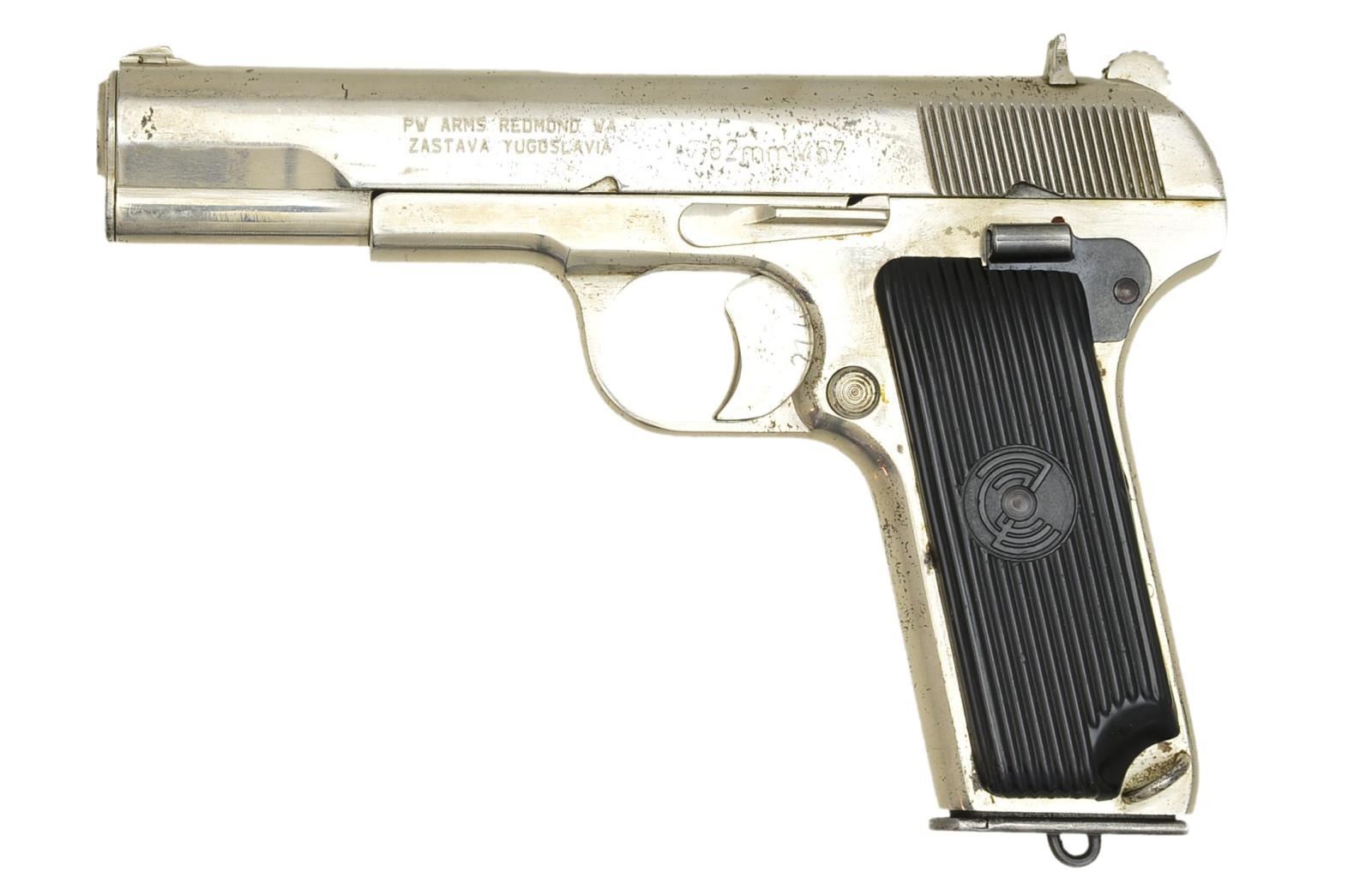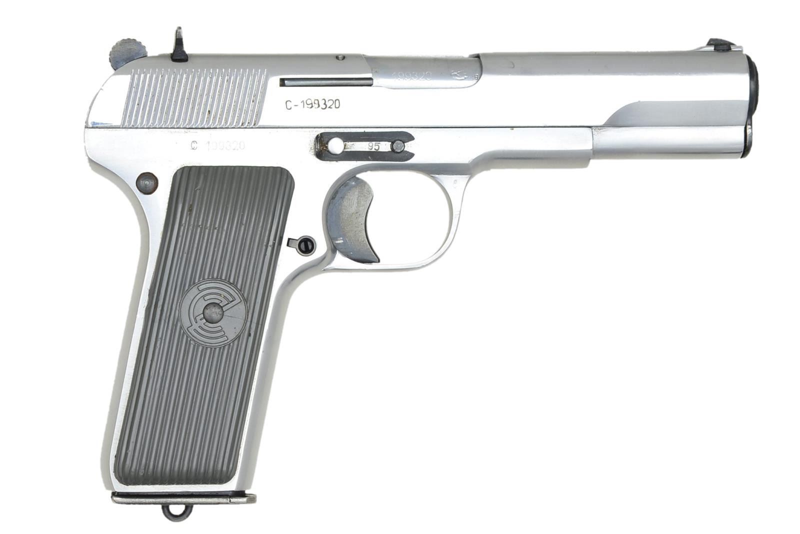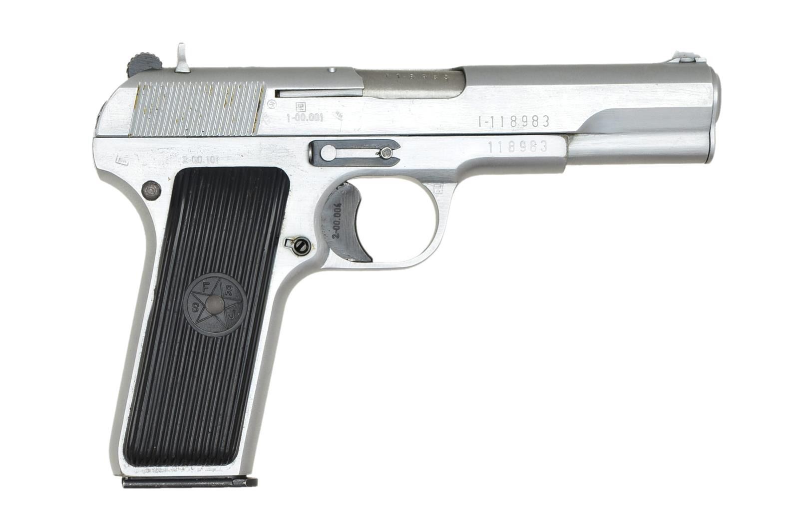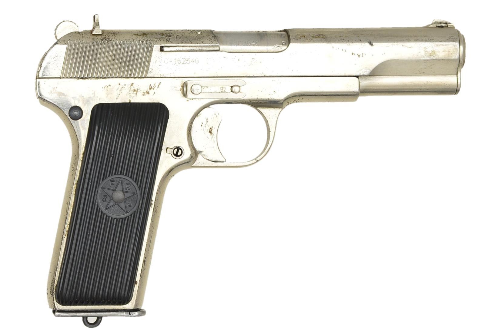 ALL: cal. 7.62x25. Bbls. 4 5/8". Mfg. In Yugoslavia & imported by PW Arms w/ US compliant thumb safeties added. Patterned after Russian Tokarev M TT33 w/ vertical grooved plastic grips. Fixed dovetailed sights; drift adj. rear. Matching numbered frames, slides & bbls. MAGS: 4 blued 9 rd. TOTAL; all very good or better w/ 3 having lanyard loops & 1 w/out. UNATTACHED ACCESSORIES: near excellent light tan flap holster w/ magazine pouch, single wide belt loop plus stud & strap retention. Another holster in good to very good condition w/ cleaning rod. Flambeau black plastic padded pistol case. 1) S# C 162546. Mfg. 1960-1961 having bright plated finish appearing chrome. CONDITION: good general appearance as plated over light to moderate oxidation. Areas of peppery appearance due to flaking finish. Very good grips. Very good to excellent bore. (21-801/NW). 2) S# C 199320. Mfg. 1960-1961 having bright plated slide & somewhat matte frame. CONDITION: very good external appearance w/ occasional light handling marks. Very good grips w/grey tone. Poor to fair bore w/ moderate pitting throughout. (21-827/NW). 3) S# 118983. Mfg. 1966-1967 having had chrome finish plus Yugoslavian crest on top rear of slide. CONDITION: Very good finish w/ very light handling marks. Very good grips & near excellent bore. (21-829/NW). ALL CURIO. $750-1,000.
