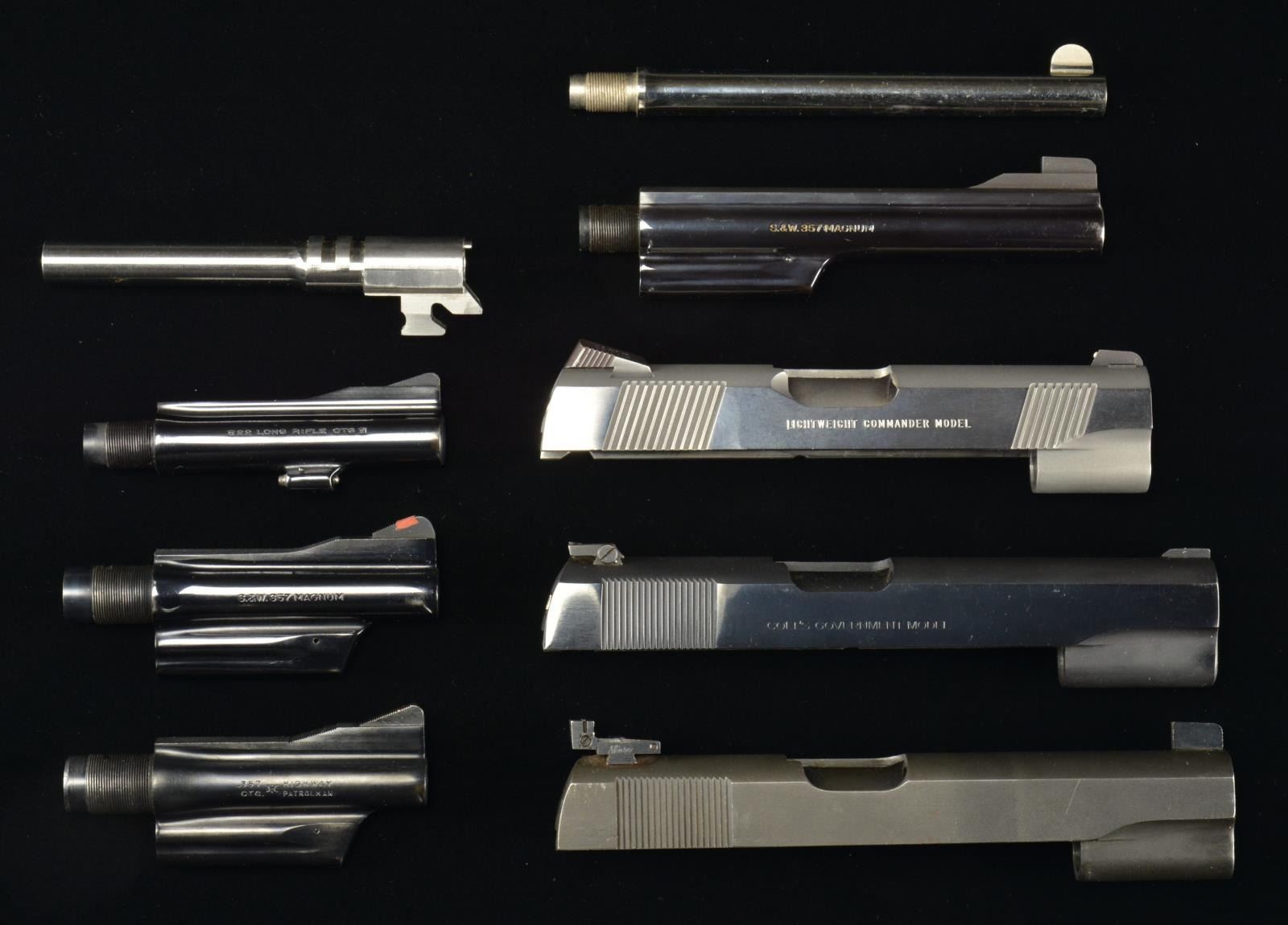 BARRELS: 1) New appearing Colt nickel plated 6" Police Positive bbl. w/ half moon front sight & cal. marked "32 POLICE CTG.". 2) Boxed Action Arms 41AE conversion bbl. for Browning Hi Power; appears new. 3) Near excellent blued S&W 4" K frame 22 LR pinned bbl. w/ grooved rib having serrated ramp front sight; no under lug. 4) Near excellent blued 4" S&W Highway Patrolman pinned 357 Mag. bbl. w/ serrated ramp front sight. 5) Very good plus blued 4" S&W Model 27 pinned 357 Mag. bbl. w/ red insert ramp front sight. 6) Very good plus blued 6" S&W Model 19 pinned 357 Mag. bbl. w/ Patridge front sight. SLIDES: 1) Colt stainless Lightweight Commander Model. Complete near excellent 80 Series w/ enhanced features of front & rear square cut cocking grooves plus lowered & flared ejection port. Blued 3 dot dovetailed sight set w/ finish loss; Novak style rear. 2) Colt 70 Series Government Model w/ factory quality refinish. Stripped except for filed down front sight & MMC white outline adj. rear. 3) Complete Remington Rand (parkerized) set up to AMU configuration w/ tall serrated faced Patridge front sight & Micro adj. rear. Very good w/ light use wear, high point wear & slight thinning. (02-14996/NW). $900-1,400.