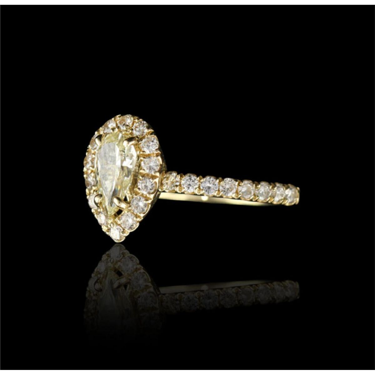 14KT Yellow Gold 0.89ctw Diamond Unity Ring A4071. Excellent Condition! UX6051SY. One electronically tested 14KT yellow gold ladies cast & assembled diamond unity ring with a bright polish finish. Condition is new, good workmanship. The ring features a yellow pear shaped diamond set within a ribbon of diamonds, completed by a diamond set two millimeter wide band. Identified with markings of "14K". Containing: One prong set round brilliant cut diamonds, measuring 7.60 - 4.00 x 2.52mm (depth est.) approximate weight of 0.44ct. Graded in the setting. Clarity: VVS-2. Color: Light Yellow. Thirty prong set round brilliant cut diamonds, measuring 1.70 - 1.50 x 0.96mm (Depth est.) approximate total weight of 30 Stones = 0.45ct. Graded in the setting. Clarity: VS-2 to SI-2 to SI-1. Total Weigh of Diamonds: 0.89ct. Total Weight of Ring: 2.68gm. AIG appraised at $3,760.00.