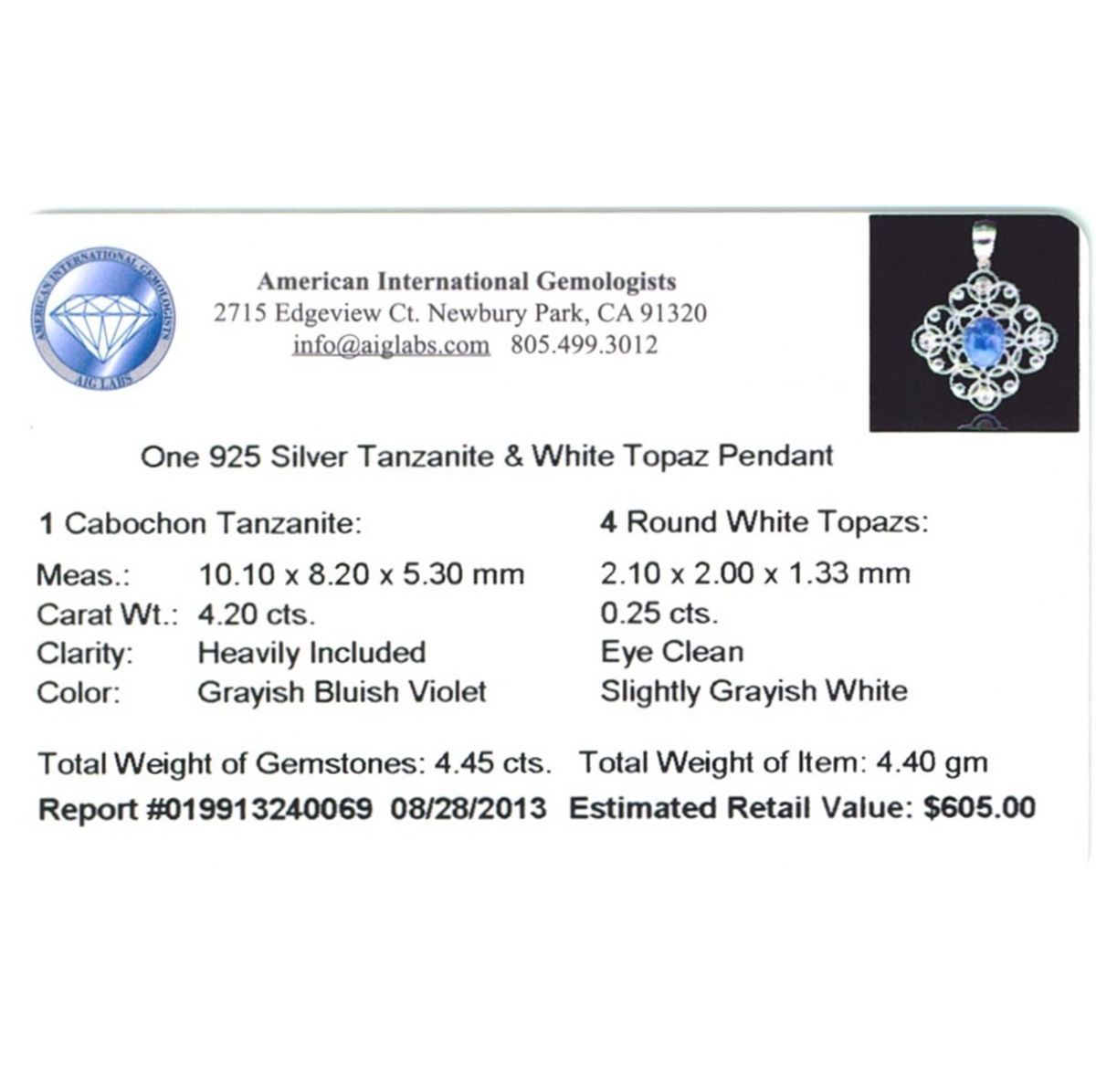 SILVER 4.20ct Tanzanite and White Topaz Pendant Without Chain SLV275. Good Condition! HC802PM. One 925 silver tanzanite and white topaz pendant containing: one cabochon tanzanite measuring 10.10 x 8.20 x 5.30mm. Carat weight is 4.20cts., clarity is heavily included, color is grayish bluish violet. This pendant also includes 4 round white topaz measuring 2.10 x 2.00 x 1.33mm. Carat weight is 0.25cts., clarity is eye clean, color is slightly grayish white. Total weight of gemstone: 4.45cts., total weight of item: 4.40 grams. AIG appraised at $605.00.