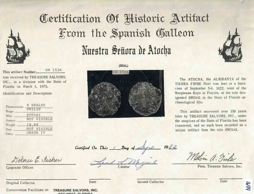 BOLIVIA, PotosÌ, cob 8 reales, Philip III, assayer not visible, Grade 4. KM-10; Cal-Type 164. 18.92 grams. Pitted shield side but with full cross, desirable as a State Release piece (indicated by the SR on the certificate). With original Fisher tag and photo-certificate SR 1526. Recovered from: Atocha, sunk in 1622 west of Key West, Florida