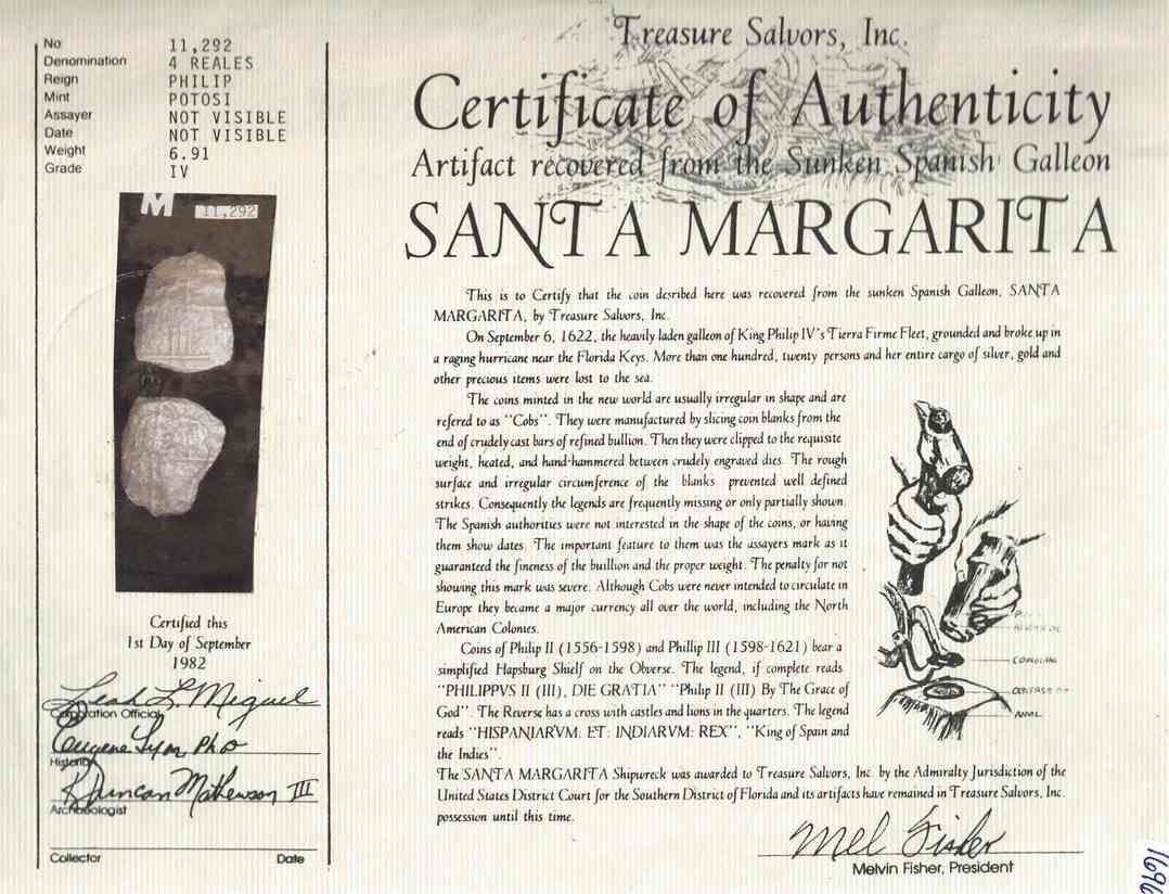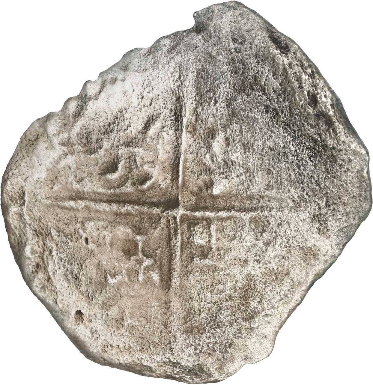 BOLIVIA, PotosÌ, cob 8 reales, Philip III, assayer not visible, quadrants of cross transposed, Grade 3. KM-10; Cal-Type 164. 11.97 grams. Thin along the edge from corrosion but with a fair amount of shield and cross detail visible. With original Fisher tag and photo-certificate 4727. Recovered from: Santa Margarita, sunk in 1622 west of Key West, Florida