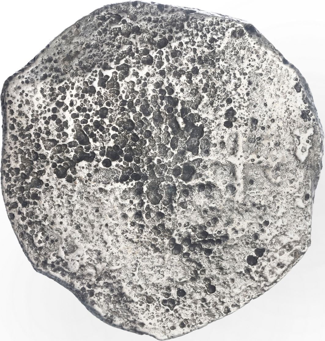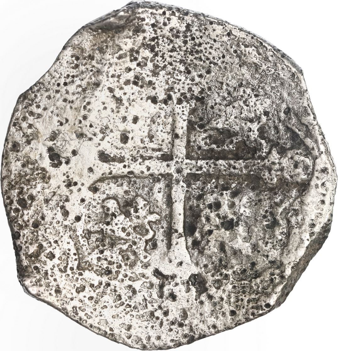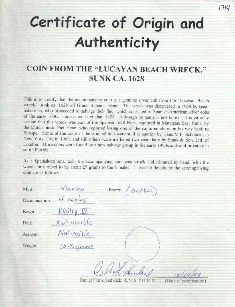 MEXICO, Mexico City, cob 4 reales, Philip IV, assayer not visible, ex-Spink. KM-38; Cal-Type 275. 10.36 grams. Solid piece with surface pitting, some shield detail and weak denomination 4, nice cross. With Sedwick certificate from 2003 and original Spink advertising booklet from the 1960s. Recovered from: "Lucayan Beach Wreck," sunk ca. 1628 off Grand Bahama Island