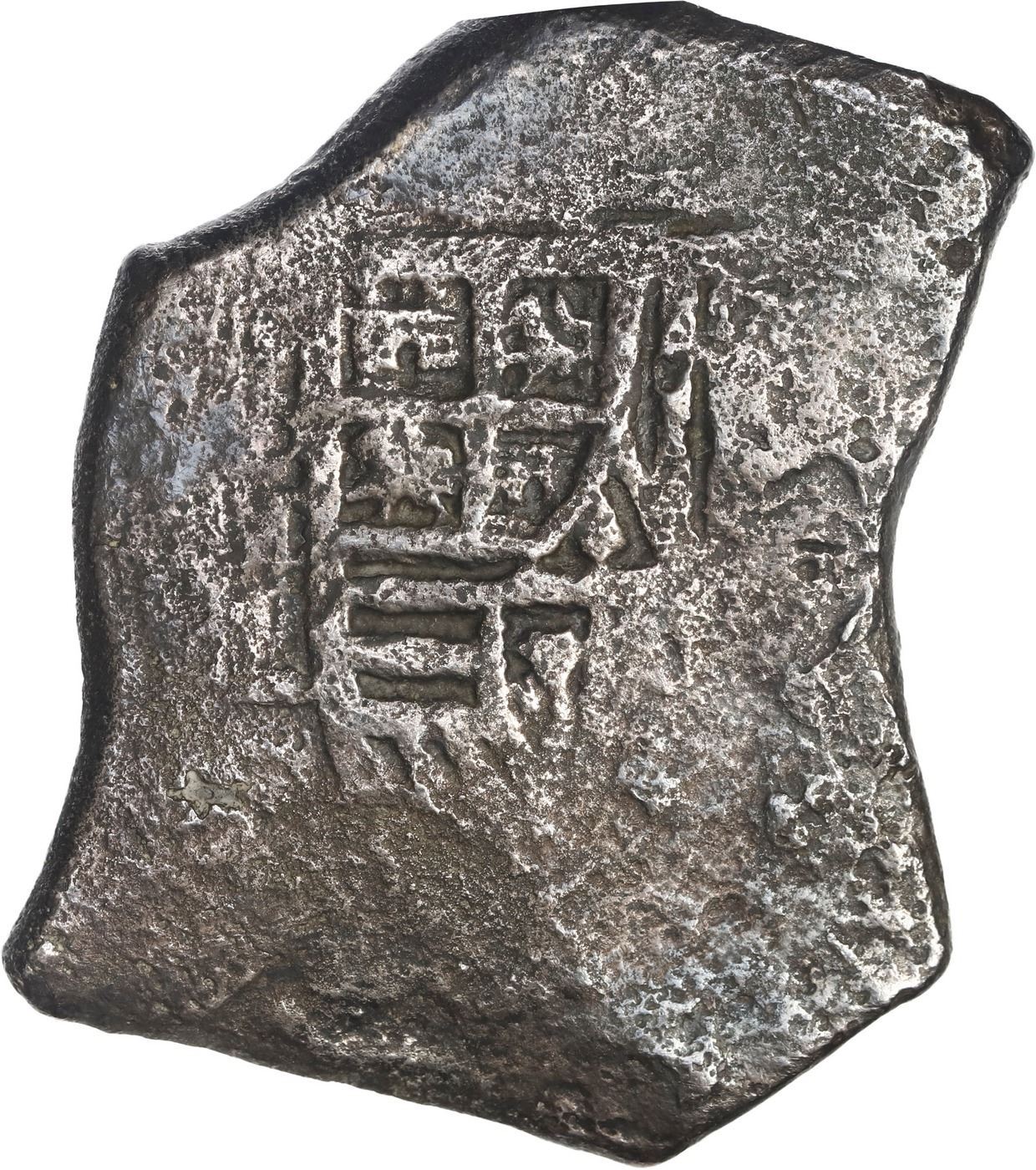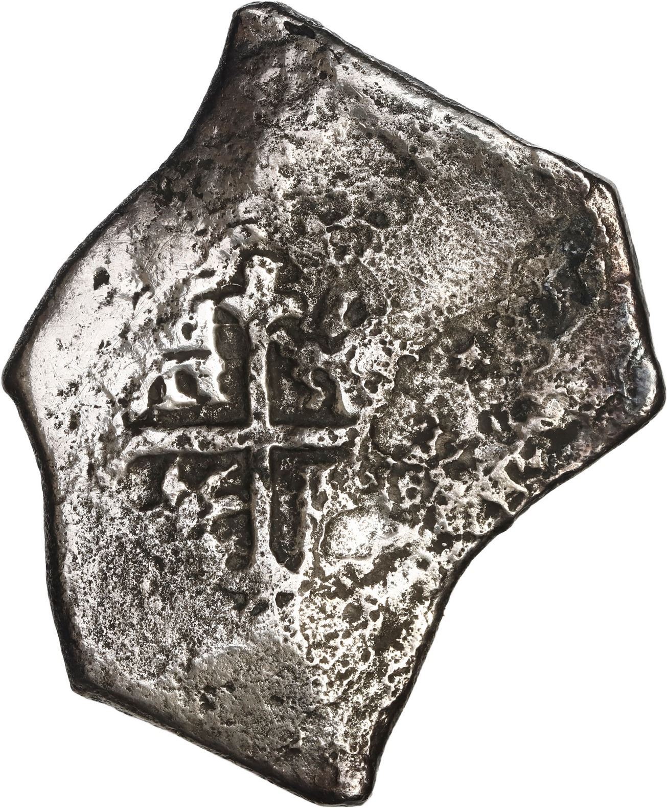 MEXICO, Mexico City, cob 8 reales, Charles II, assayer L. S-M21; KM-46; Cal-Type 108. 24.53 grams. Oddly shaped piece with bold partial shield and cross, barely visible assayer, lightly corroded surfaces and darkly toned (particularly the obverse). Recovered from: Joanna, sunk in 1682 off South Africa