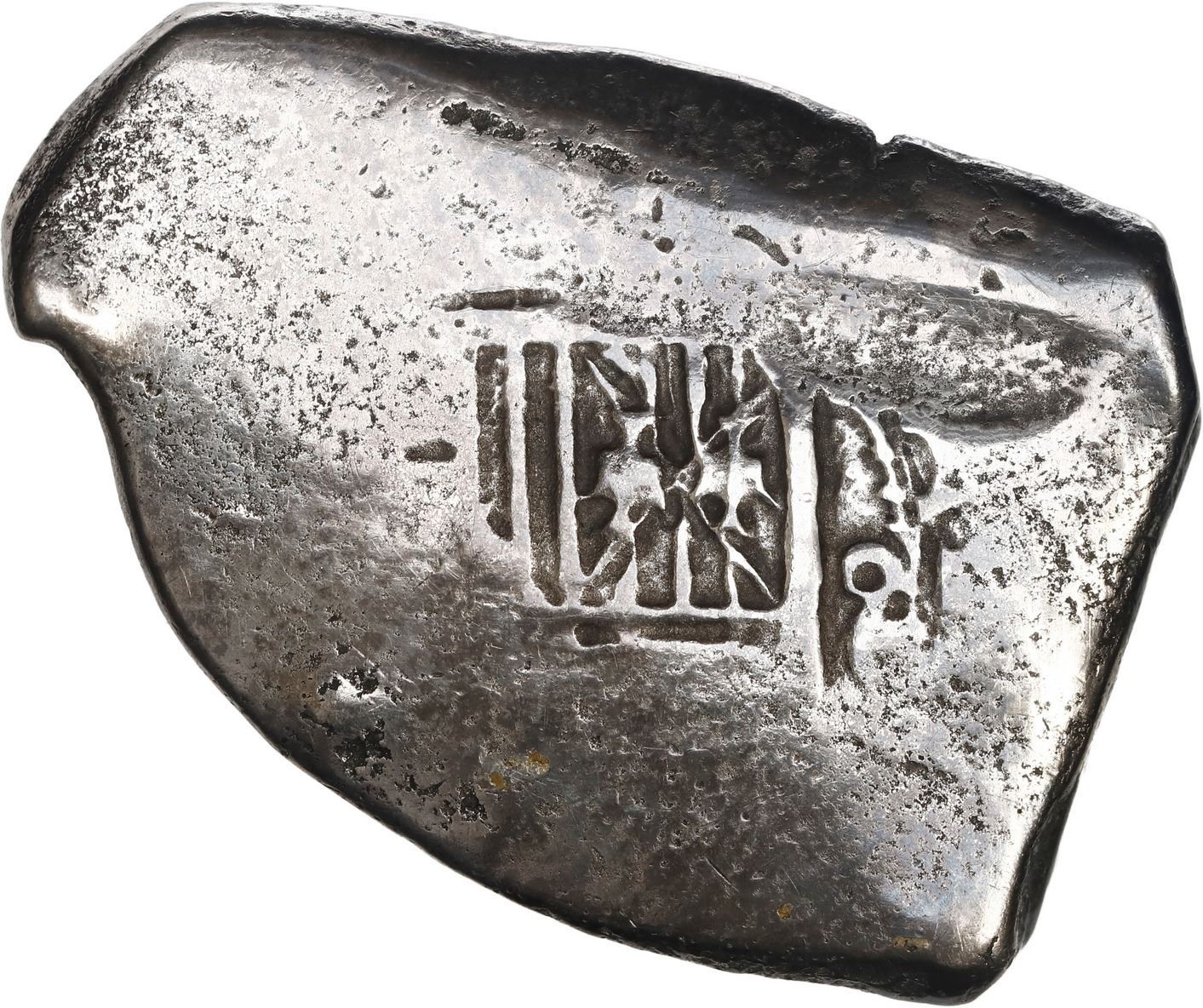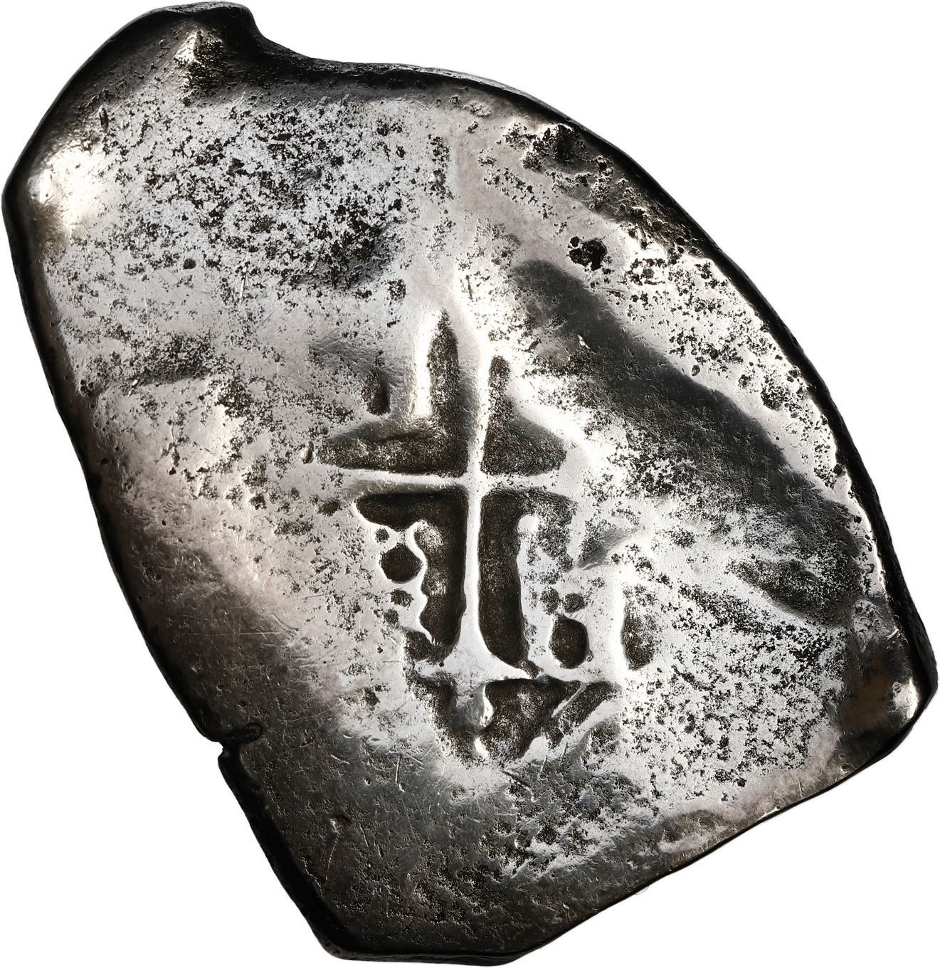 MEXICO, Mexico City, cob 8 reales, Charles II, assayer not visible. KM-46; Cal-Type 108. 20.02 grams. Solid piece with corroded and polished surfaces, partial shield with clear denomination 8 visible, some cross detail also present. Recovered from: Joanna, sunk in 1682 off South Africa