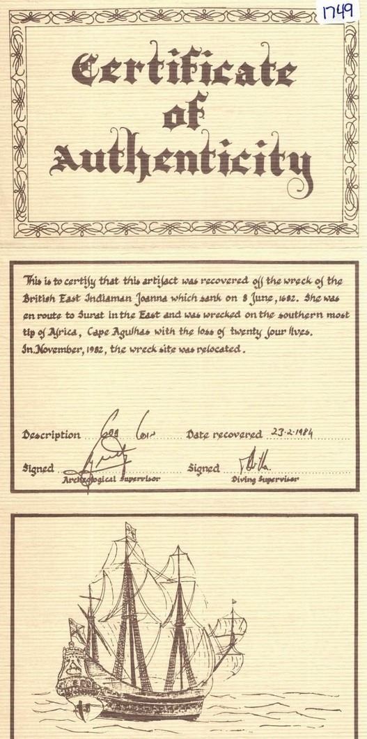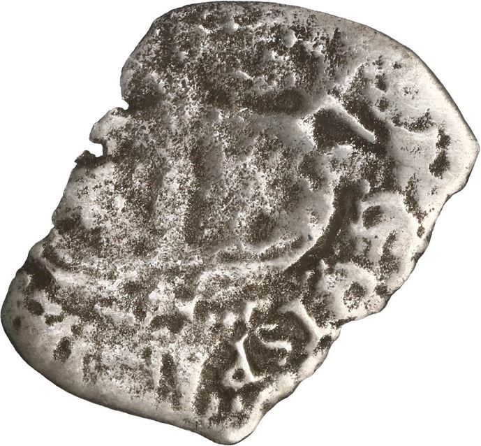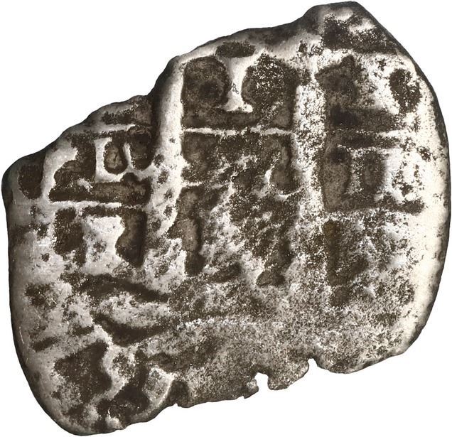 BOLIVIA, PotosÌ, cob 1 real, 1667 E. S-P37a; KM-13; Cal-unl (Type 206). 0.97 gram. Thin from corrosion but with clear date below partial pillars, cross a bit weak but also dated along with some visible edge legend. With generic certificate from the salvors. Recovered from: Joanna, sunk in 1682 off South Africa