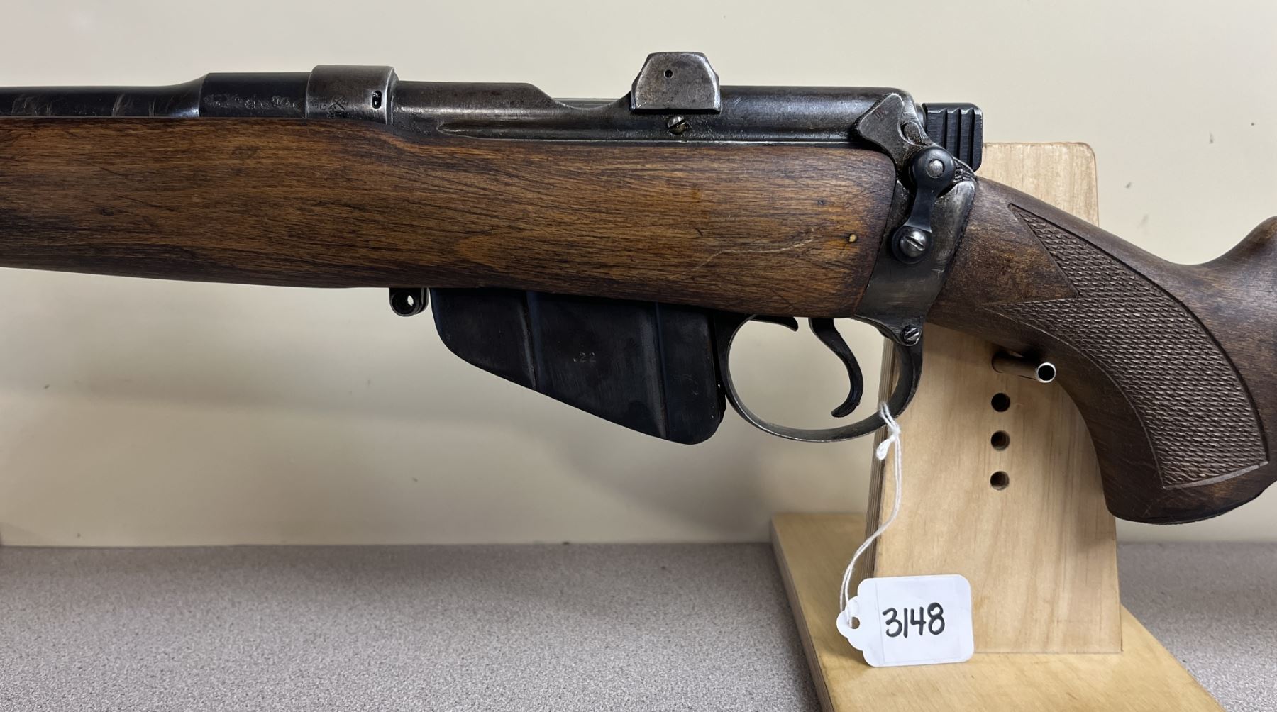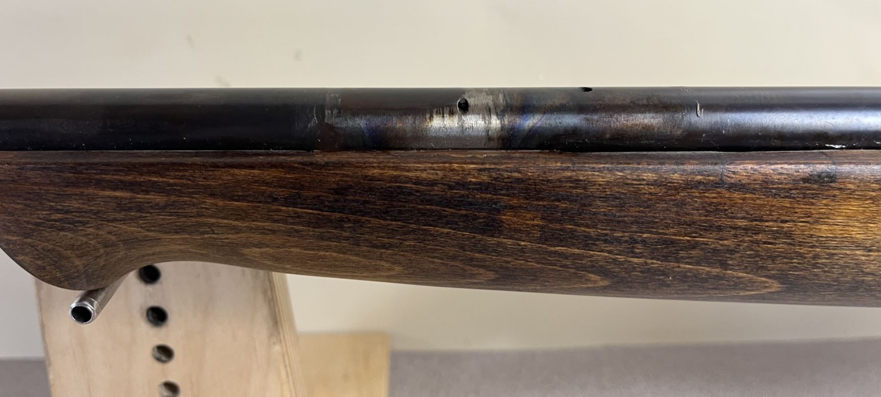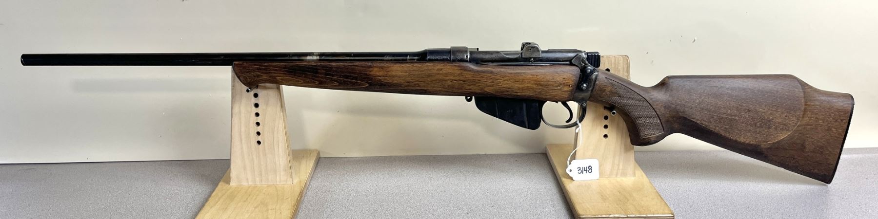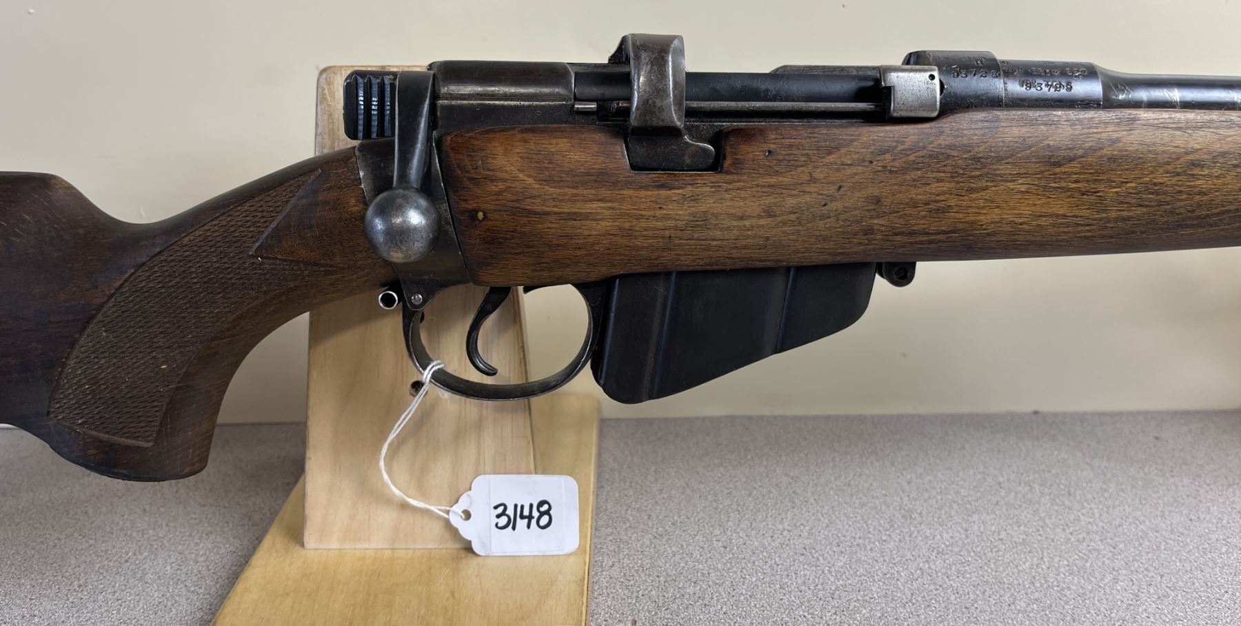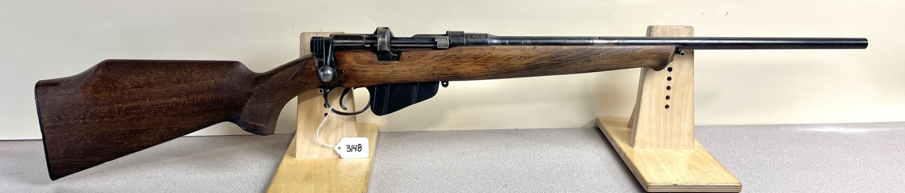 CONDITION: F OVERALL INCL BORE. NO SIGHTS. HEAT DISCOLORATION ON BBL POSSIBLY WHERE SIGHT WAS MOUNTED. SPECS: 21 IN BBL. STAMPED 1916. COMMERCIAL SPORTER STOCK WITH CHEEK PIECE. EXTRAS: NONE. S/N: 93728.