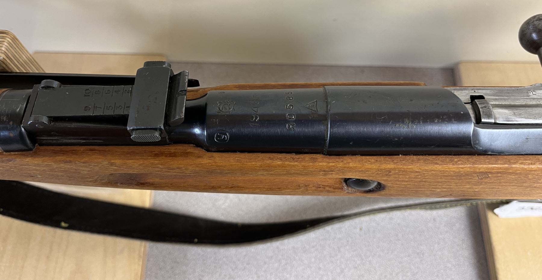 CONDITION: G OVERALL INCL BORE. SPECS: 21IN BBL. EXTRAS: LEATHER SLING. S/N: R0589.