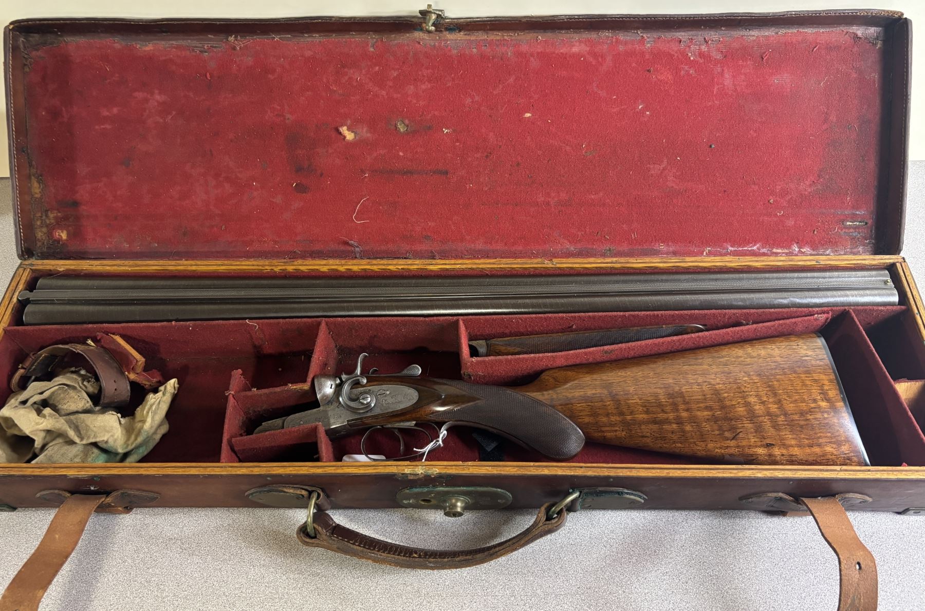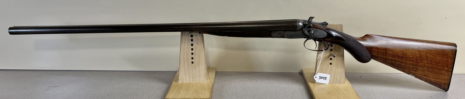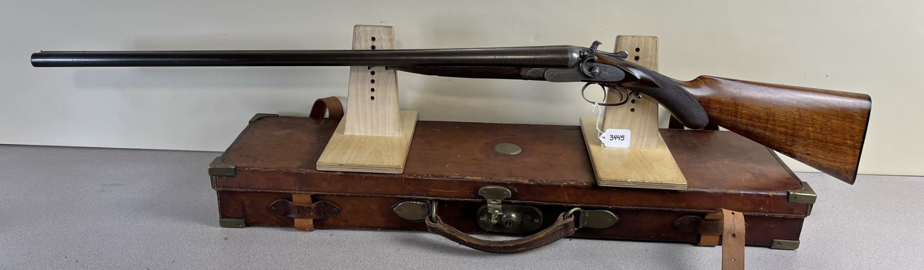 CONDITION: G-VG OVERALL. BORES G. SPECS: 30IN DEMASCUS SXS BBLS. SKEET BY MOD CHOKE. EXTRAS: ORIGINAL LEATHER HARD CASE. S/N: 122.