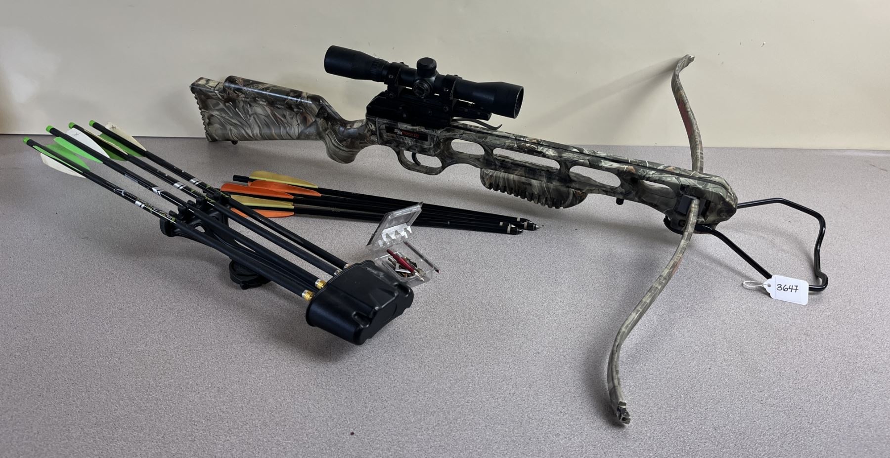 CONDITION: F OVERALL. MISSSING STRING. SPECS: NO DRAW WEIGHT LISTEN ON BOW. 27IN ACROSS LIMBS. EXTRAS: 4 X 32 SCOPE W/ RANGE FINDING RETICLE. CLEAR W/ CROSSHAIRS. QUIVER & 4X COMPLETE BOLTS. 4X TARGET BOLTS MISSING NOCKS. ASSORTED ARROW HEADS. S/N: NONE.