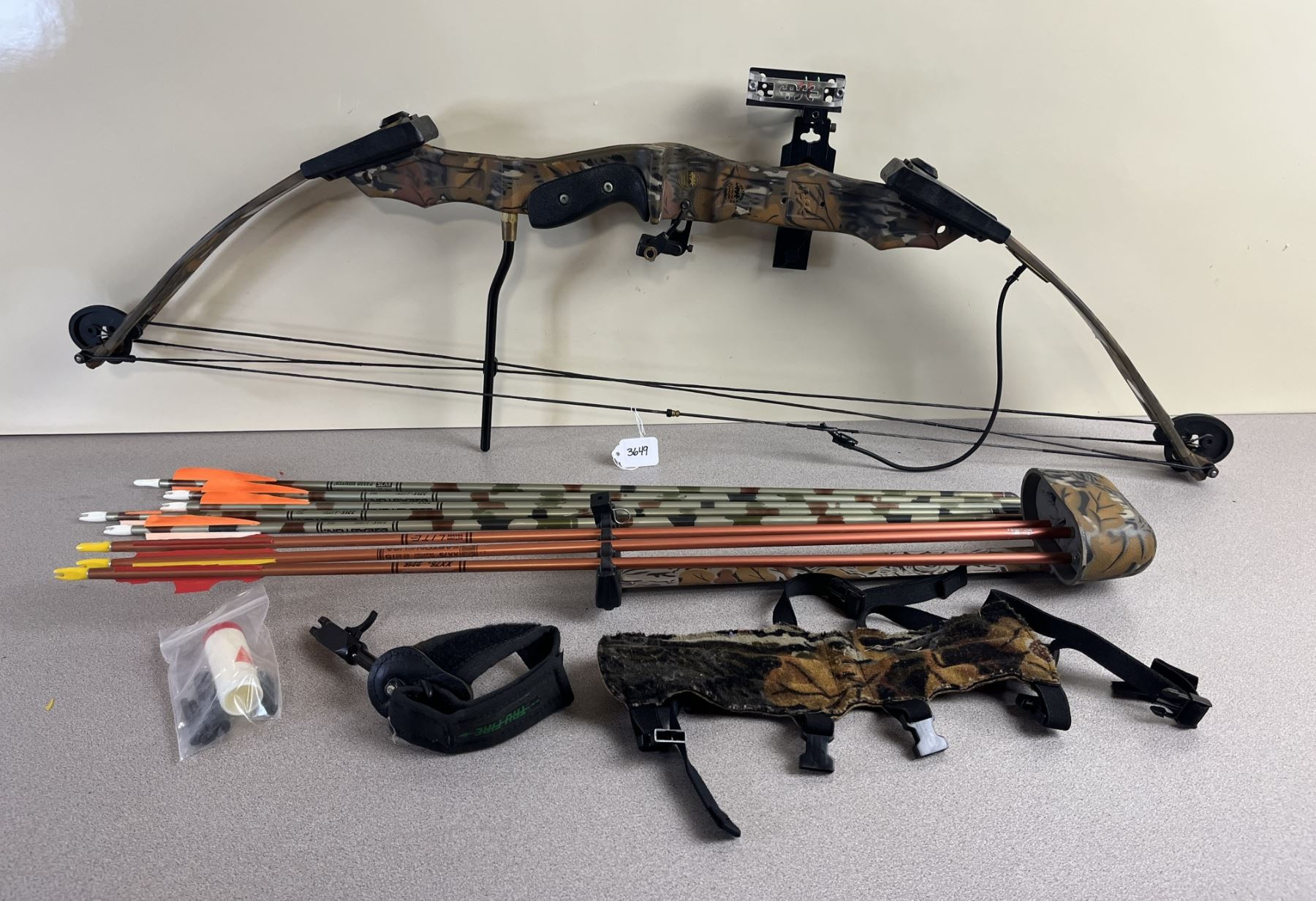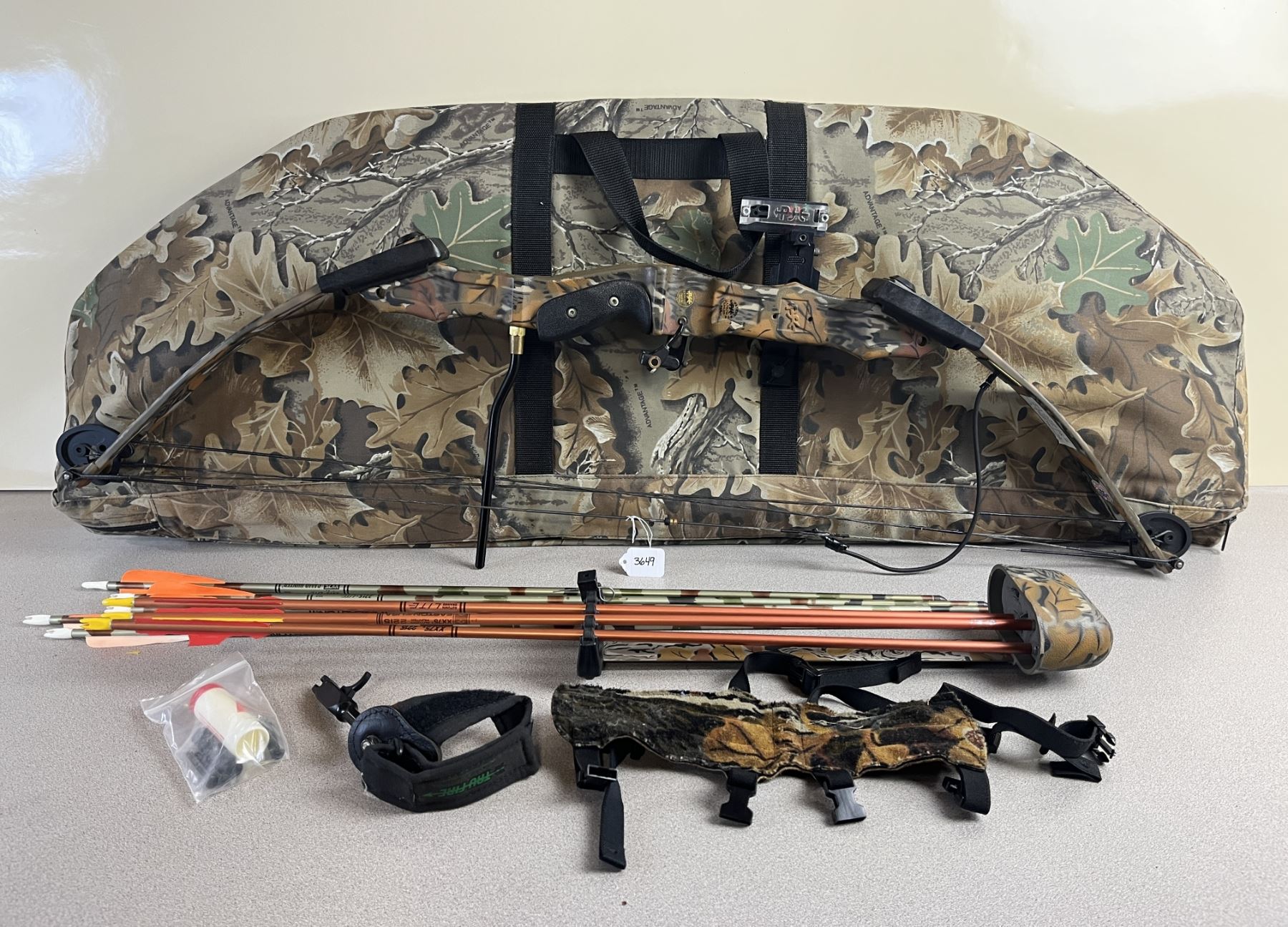 CONDITION: F OVERALL. SPECS: 60LB DRAW WEIGHT. 28IN DRAW LENGTH. RIGHT HAND. EXTRAS: CAMO SOFT CASE. QUIVER. 5X CAMO ARROWS W/ FIELD TIPS. 3X ORANGE ARROWS - 2X W/ HEADS -1X MISSING HEAD - ALL 3 DAMAGED FLETCHING. STRING WAX. TRIGGER RELEASE. ARM PROTECTOR. S/N: 0340667.