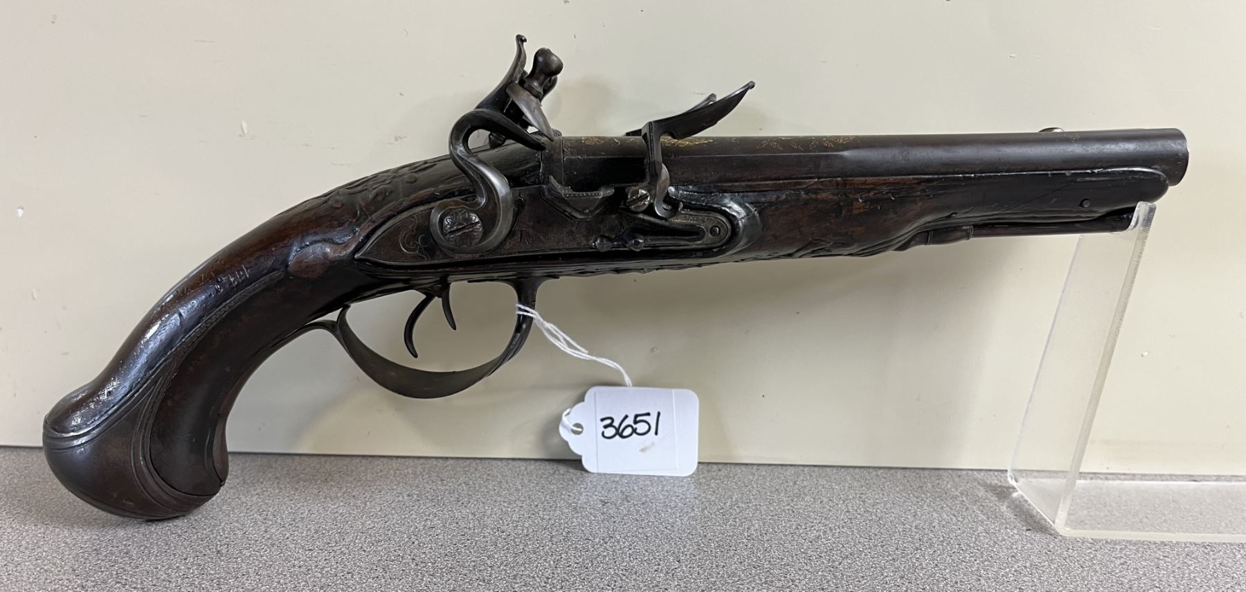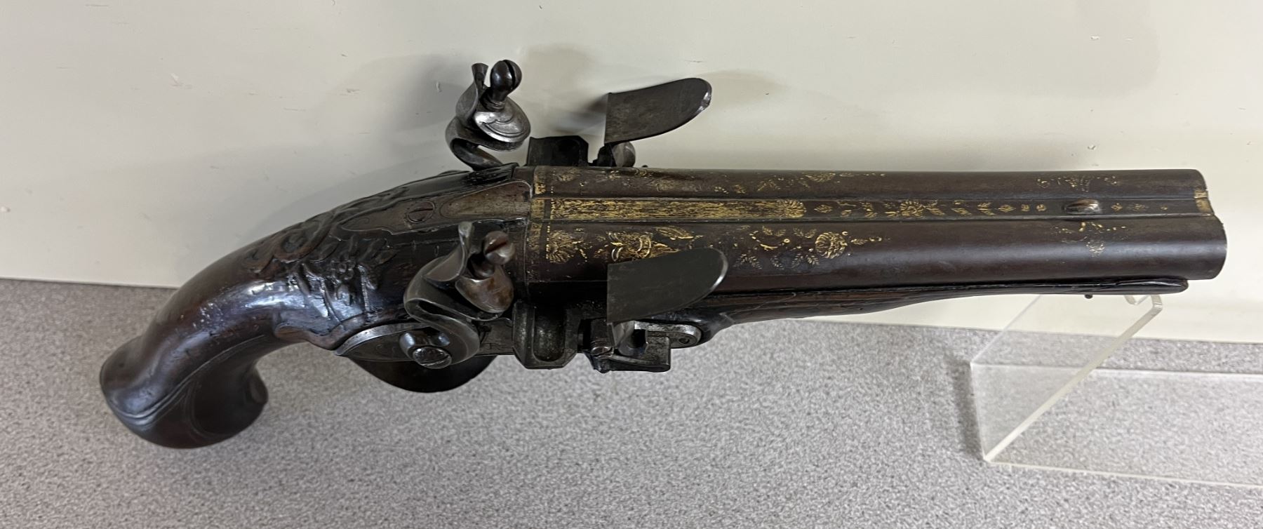 CONDITION: G OVERALL INCL BORES. BOTH LOCKS SHOWING FULL & HALF COCK. SPECS: 6.5IN SXS BBLS W/ IRON SIGHT. FLORAL PATTERNS THROUGHOUT STOCK & METAL WORK. GOLD (?) FLORAL DESIGN ON BBLS. EXTRAS: NONE. S/N: NONE.