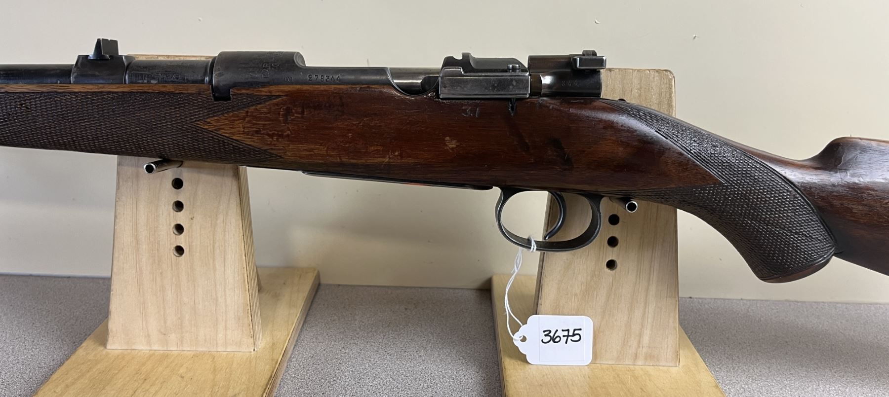 CONDITION: F OVERALL INCL BORE. STOCK REPAIRED AT PISTOL GRIP. SPECS: 23.5IN BBL W/ IRON SIGHTS. DRILLED & TAPPED FOR SCOPE MOUNTS. EXTRAS: NONE. S/N: 279344.