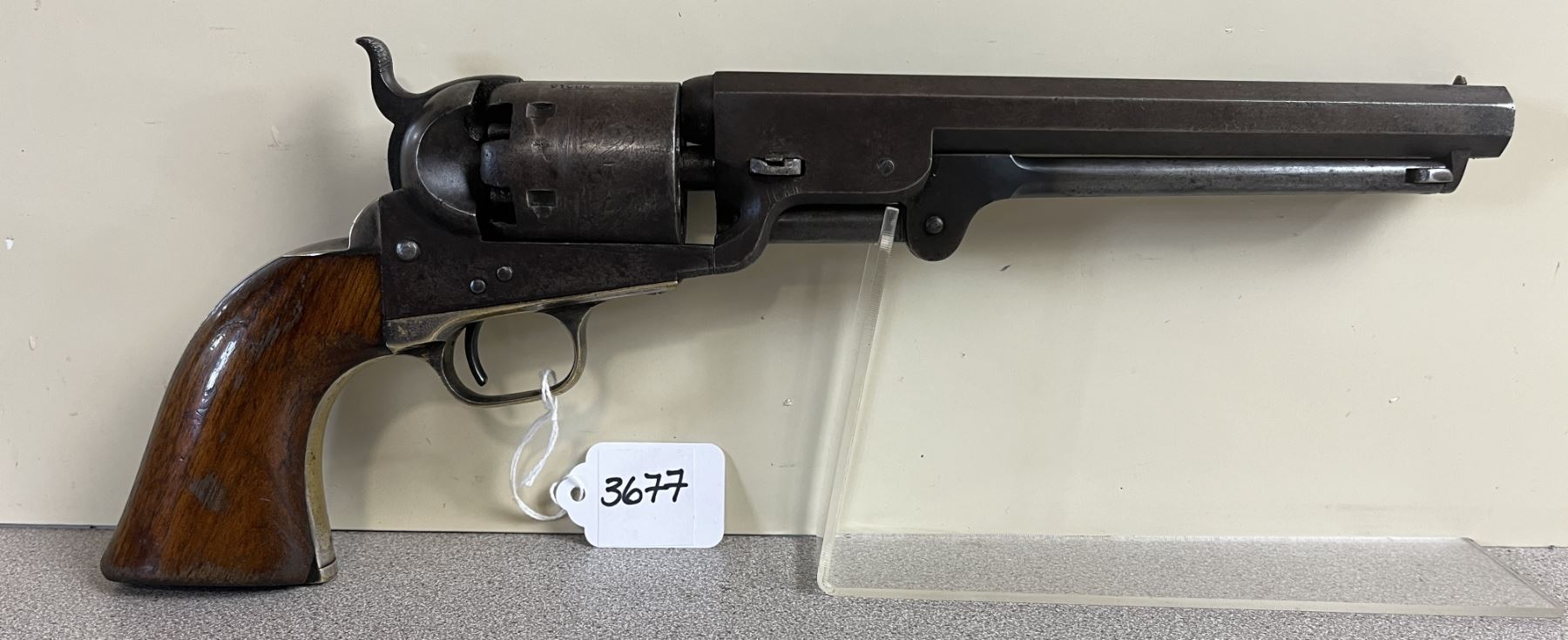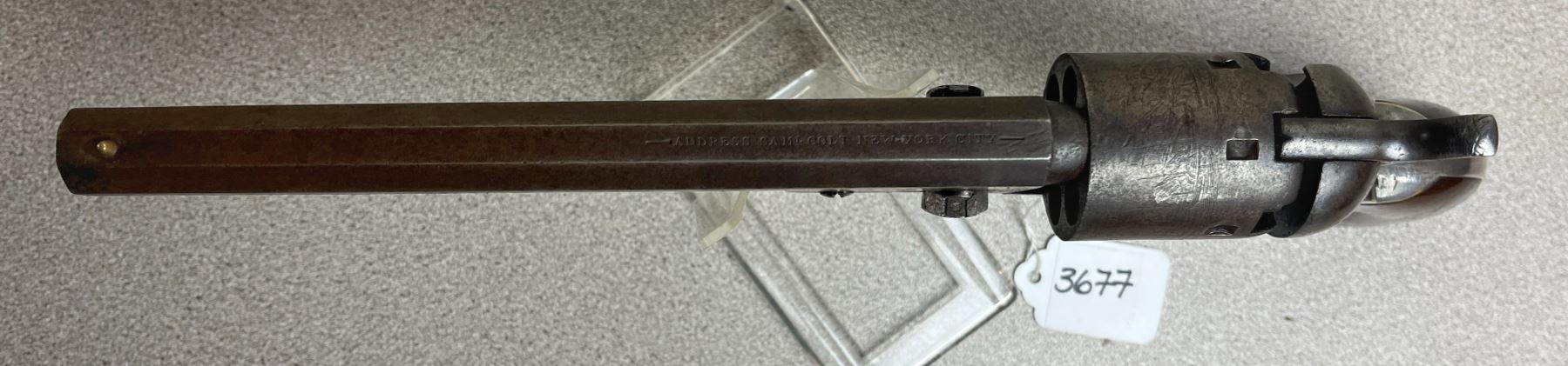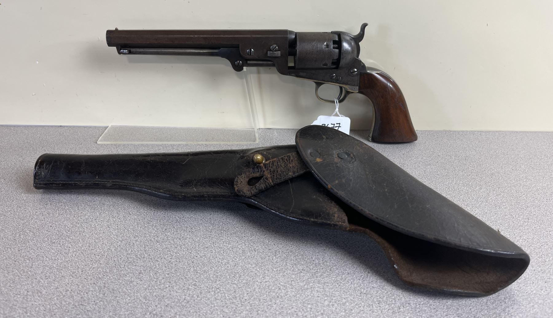 CONDITION: G OVERALL. BORE F-G. TIMING & LOCK UP G. NICKLE PLATING ON FRAME APPROX 60%. CYLINDER SCENE VISIBLE. SOME CASE COLORS PRESENT ON LOADING LEVER. SPECS: 7.5IN OCTAGON BBL. 6 SHOT REVOLVER. EXTRAS: PERIOD LEATHER HOLSTER. S/N: 58616. BBL, RECEIVER, TRIGGER GUARD, FRAME & CYLINDER MATHING NUMBERS. WEDGE - 1819.