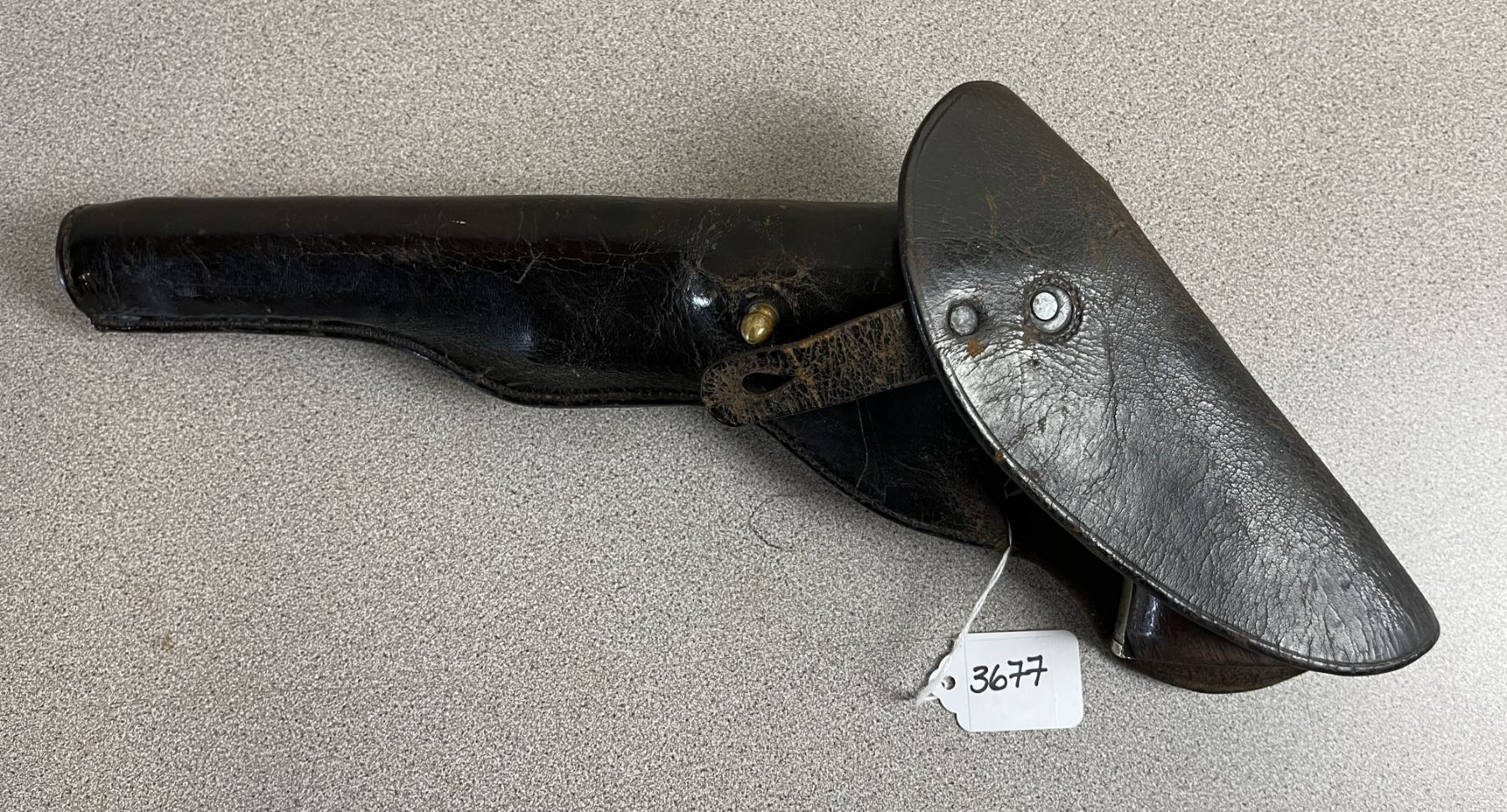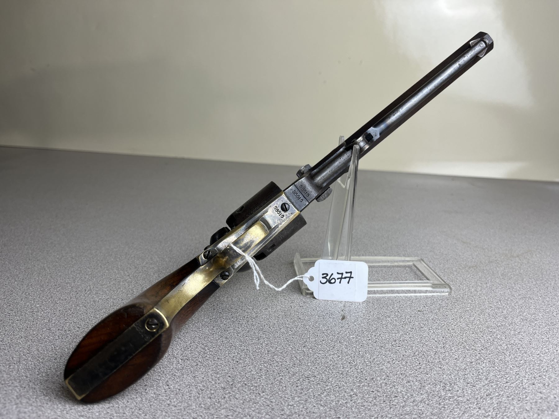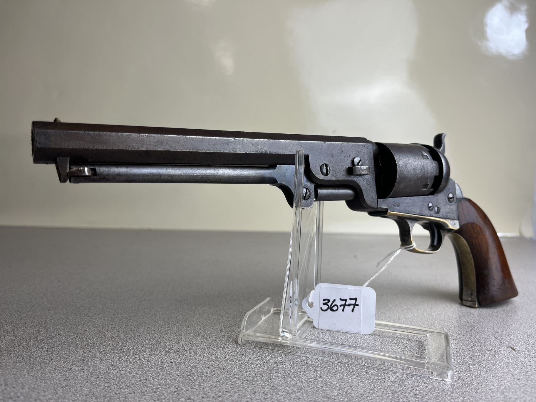 CONDITION: G OVERALL. BORE F-G. TIMING & LOCK UP G. NICKLE PLATING ON FRAME APPROX 60%. CYLINDER SCENE VISIBLE. SOME CASE COLORS PRESENT ON LOADING LEVER. SPECS: 7.5IN OCTAGON BBL. 6 SHOT REVOLVER. EXTRAS: PERIOD LEATHER HOLSTER. S/N: 58616. BBL, RECEIVER, TRIGGER GUARD, FRAME & CYLINDER MATHING NUMBERS. WEDGE - 1819.