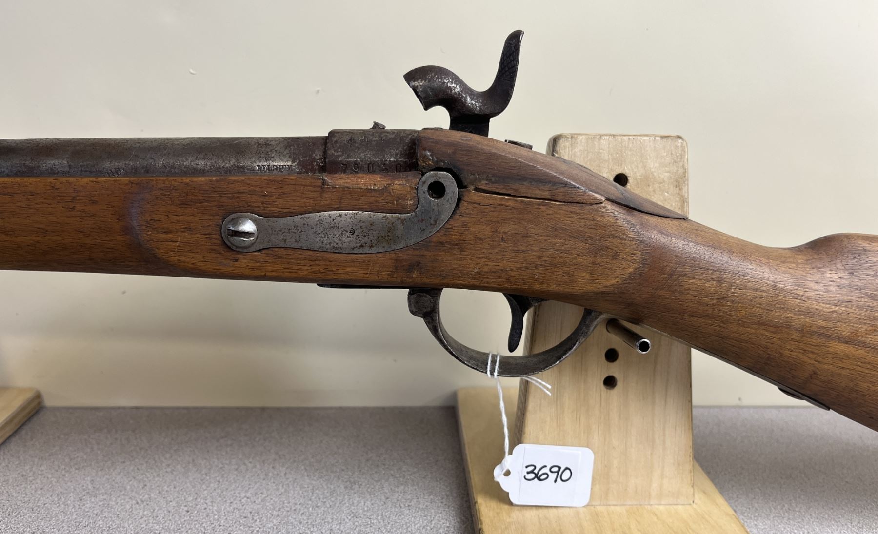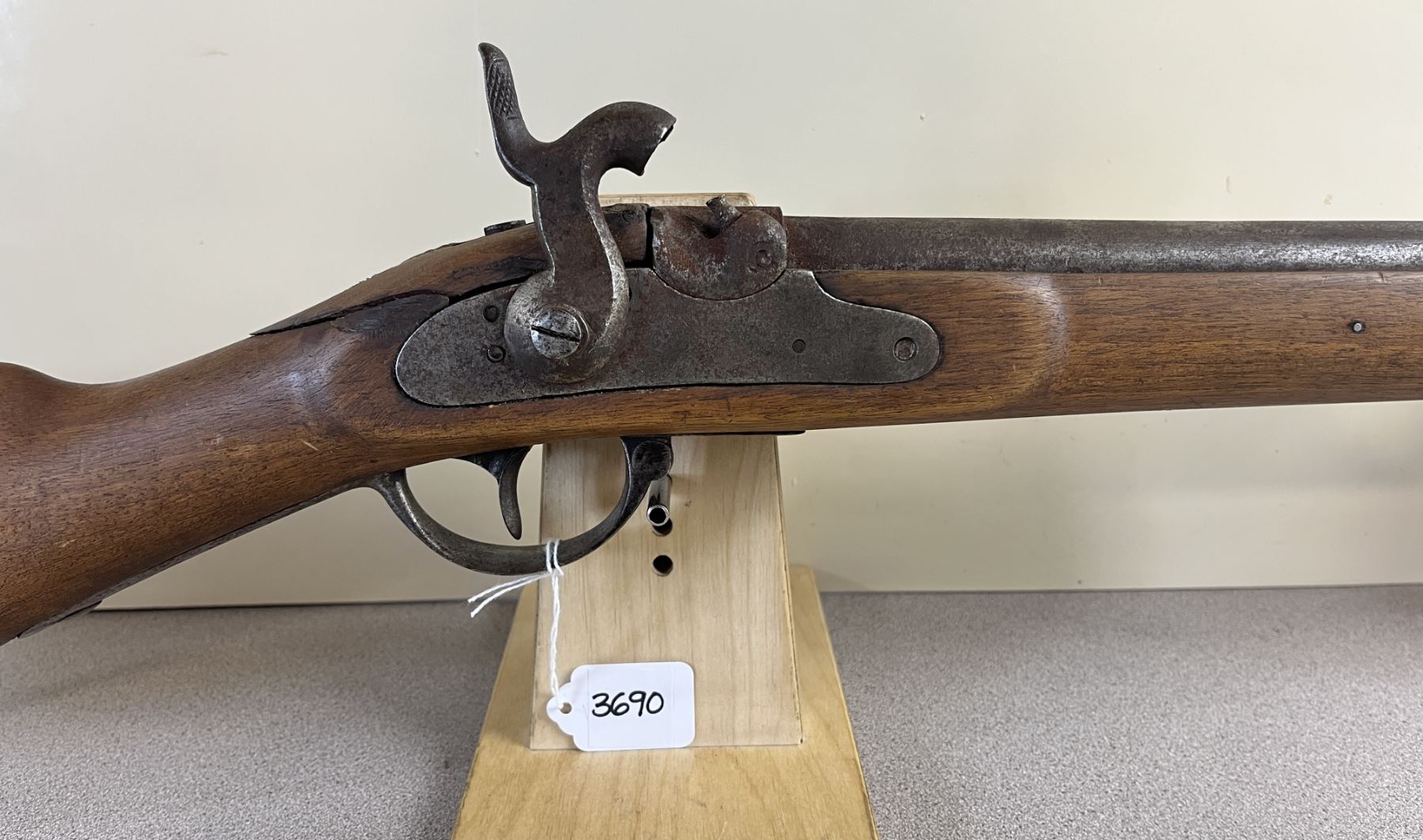 CONDITION: P-F OVERALL INCL BORE. SEVERAL LARGE BREAKS IN STOCK AT TANG. NIPPLE CRUSHED. RUST THROUGHOUT. SPECS: 35IN SMOOTH BORE BBL. EXTRAS: NONE. S/N: 79060.