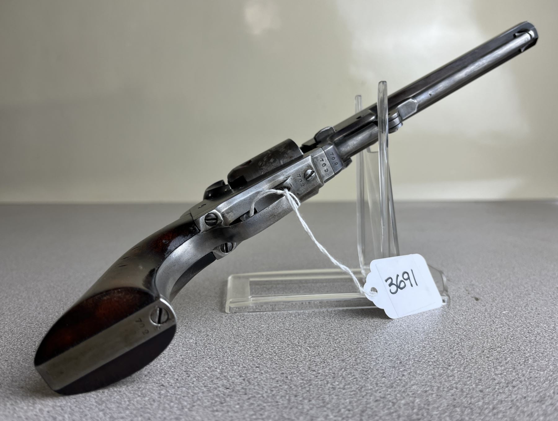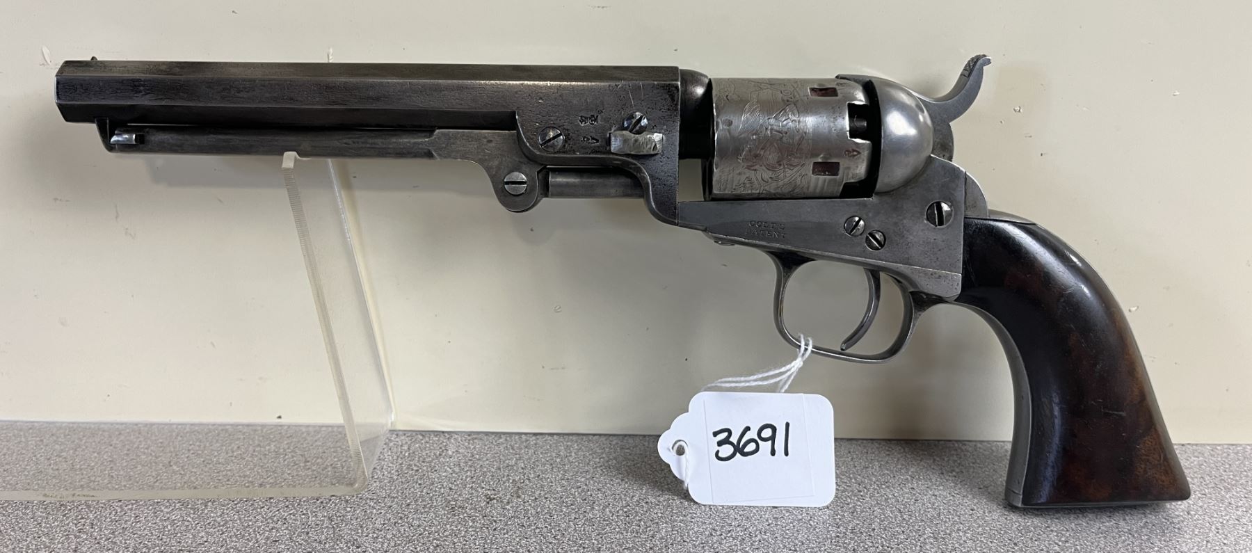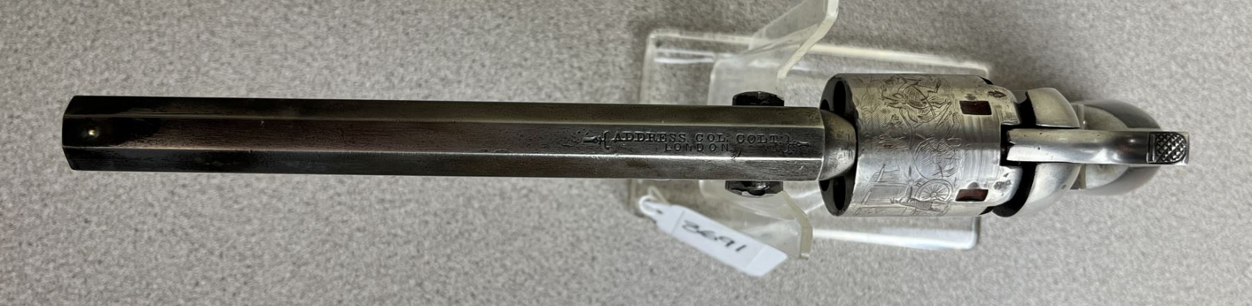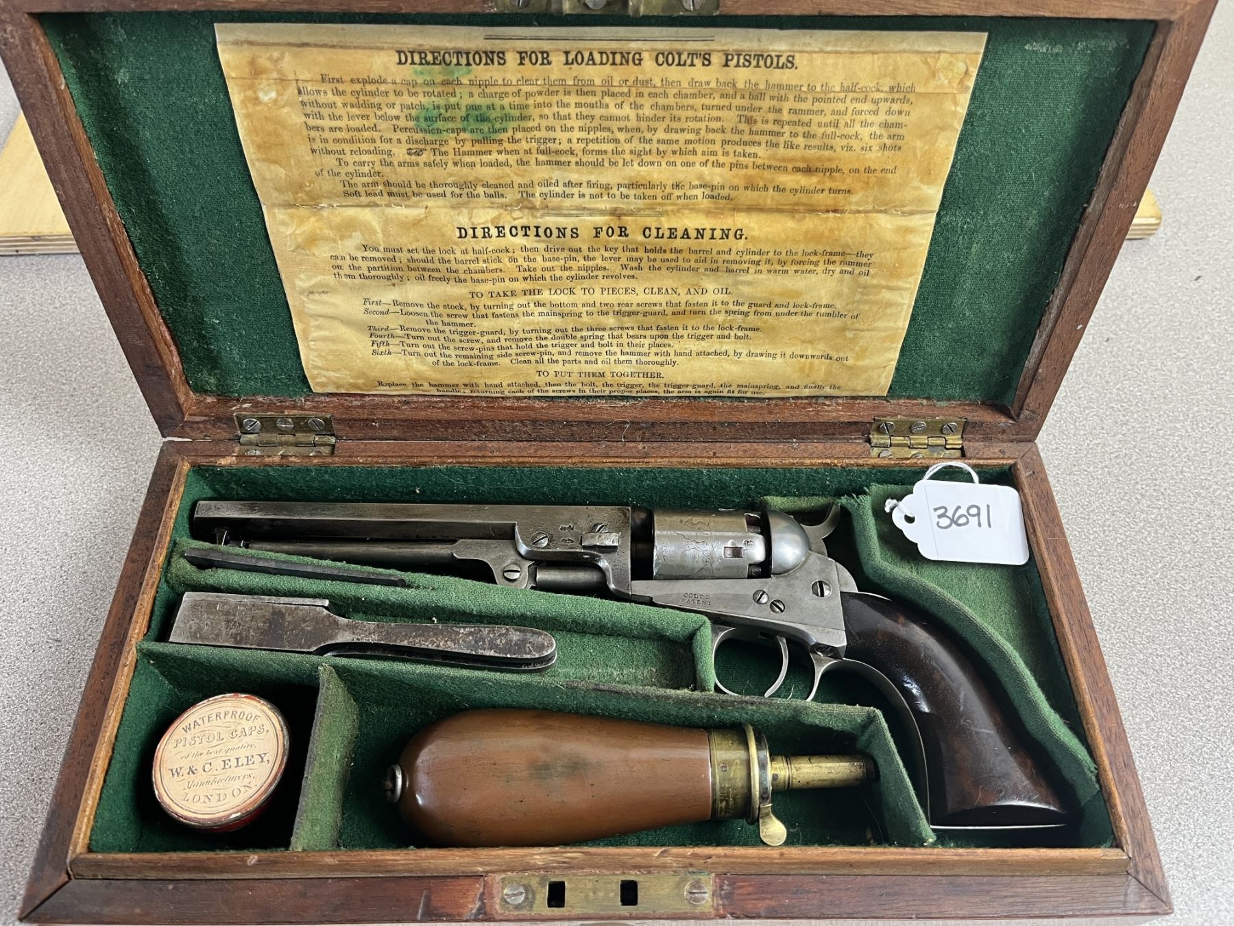 CONDITION: G OVERALL INCL BORE. TIMING & LOCK UP G. SPECS: 6IN OCTAGON BBL. EXTRAS: PERIOD CASE. COLT BULLET MOULD. ELEY PERCUSSION CAP TIN. POWDER FLASK. SMALL QTY OF PROJECTILES. S/N: 702 ON CYLINDER, BBL LOADING LEVER, WEDGE, FRAME, TRIGGER GUARD & GRIP BUTT.