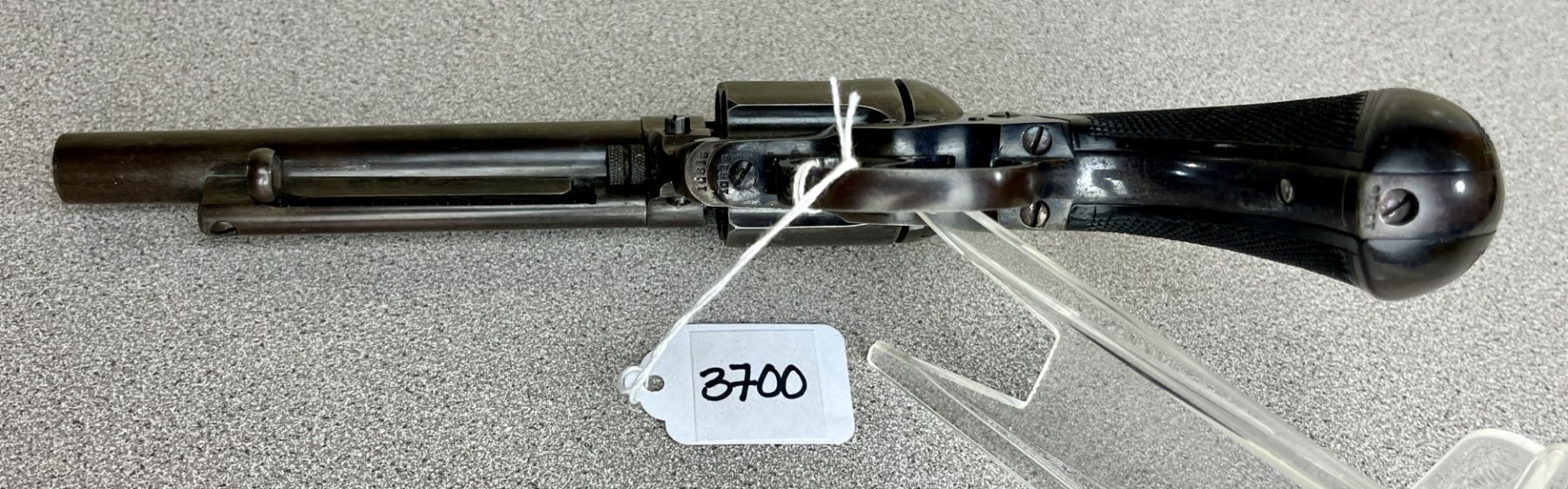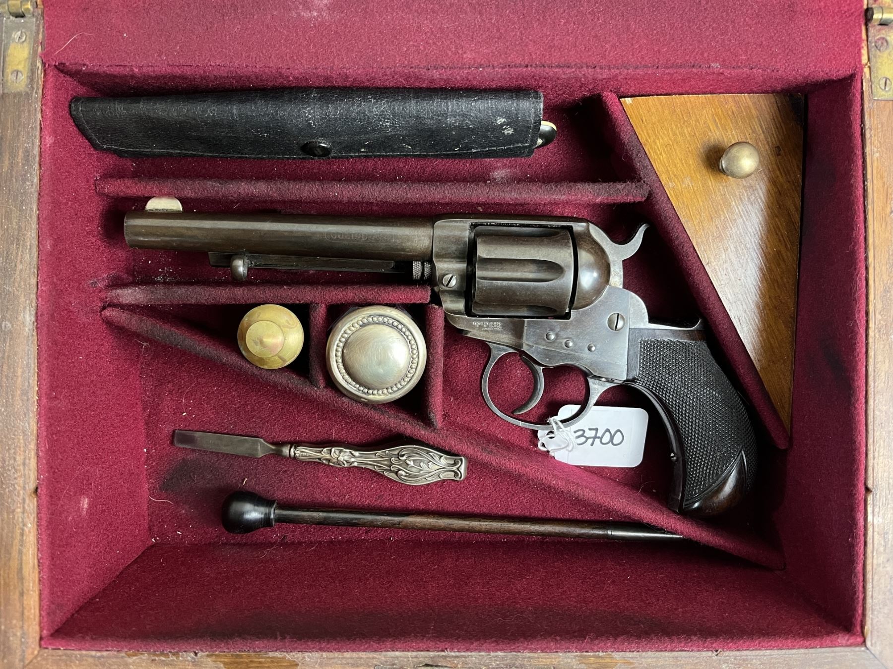 CONDITION: G-VG OVERALL INCL BORE. SHOW APPROX 50% BLUEING. BORE IS PRIMARILY SHINY - SMALL AREAS OF CORROSION. TIMING & LOCK UP G - IN BOTH SINGLE & DOUBLE ACTION. SPECS: 5IN BBL. 6 SHOT REVOLVER. EXTRAS: PERIOD WOODEN CASE W/ ACCESSORIES (SEE PICS). S/N: 10816.