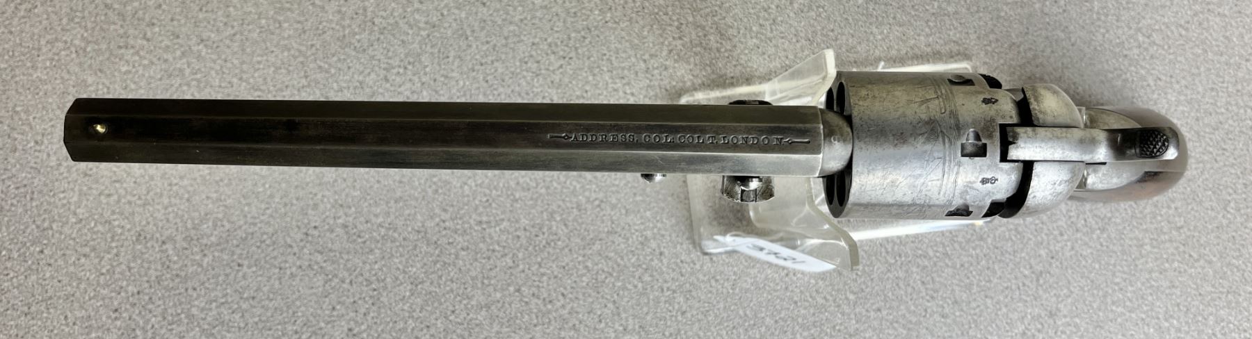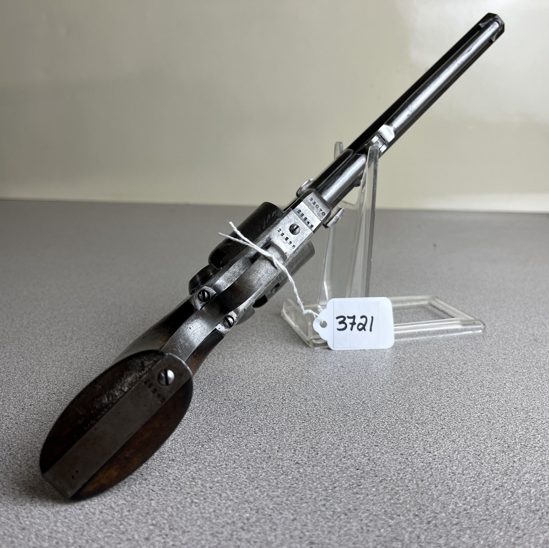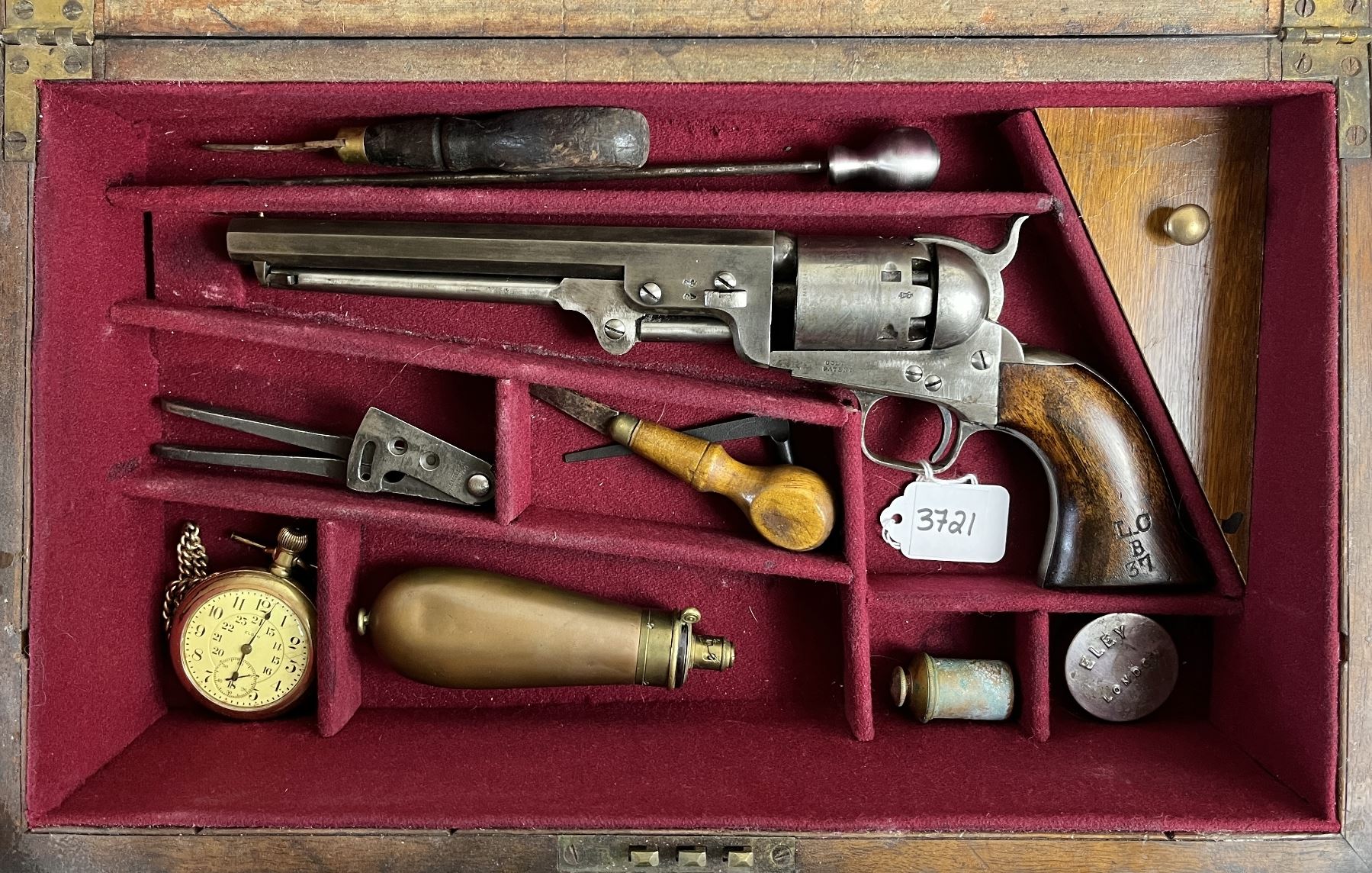 CONDITION: G OVERALL INCL BORE. TIMING & LOCK UP G. SPECS: 7.5IN OCTAGON BBL. LEFT GRIP STAMPED L.C - B - 37 (SEE PICS). EXTRAS: PERIOD WOODEN CASE W/ ACCESSORIES (SEE PICS). S/N: 28898 ON RECEIVER, TRIGGER GUARD & GRIP PLATE. 28070 ON CYLINDER, BBL, LOADING LEVER & WEDGE.
