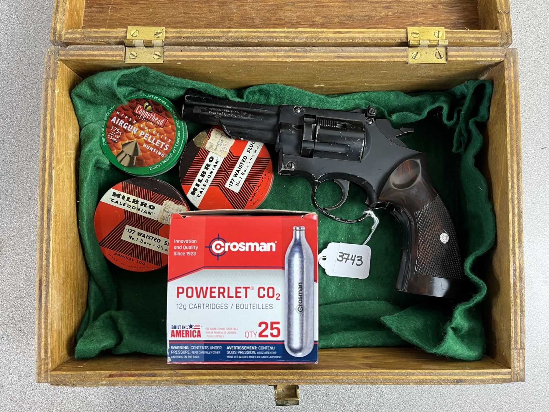 CONDITION: F OVERALL. SPECS: APPROX 4IN BBL. EXTRAS: WOODEN CASE. 254 CROSMAN CO2 CARTRIDGES. 3X OPEN TINS OF PELLETS. S/N: NONE.