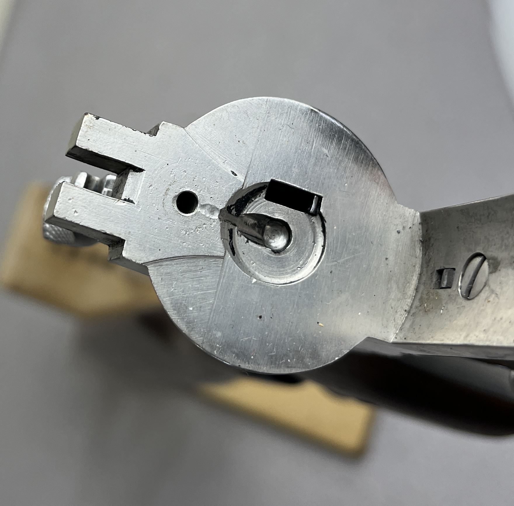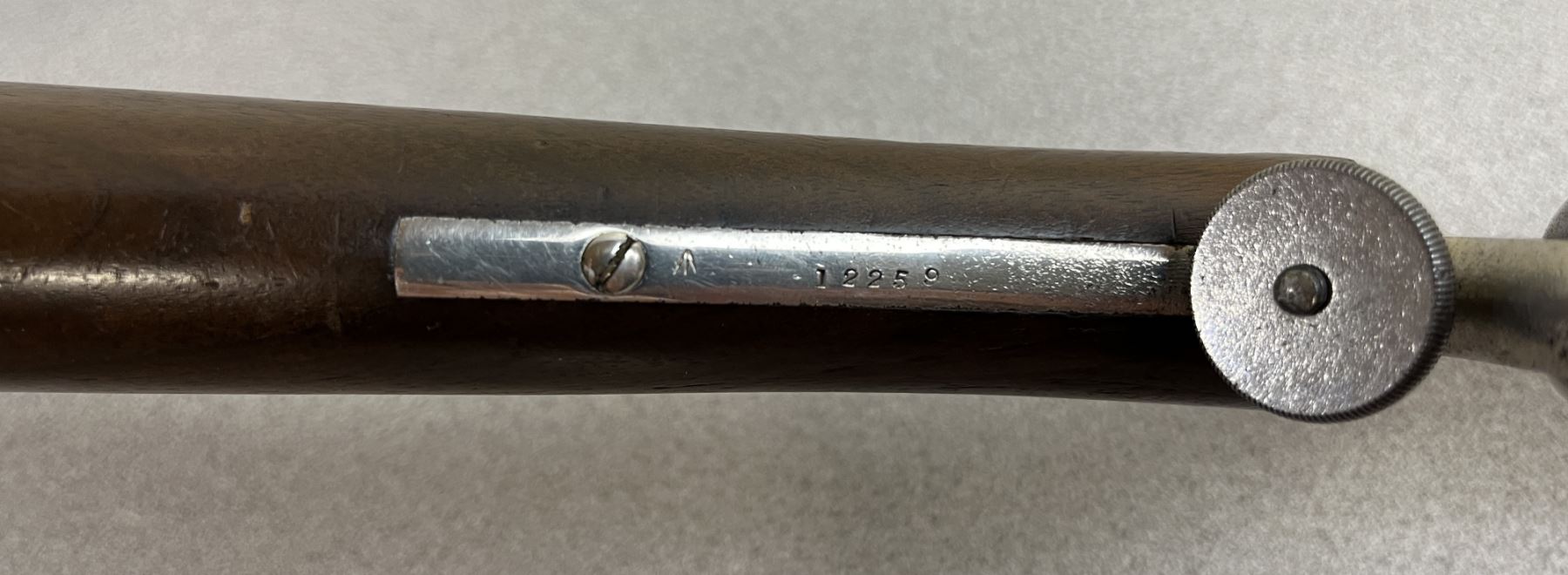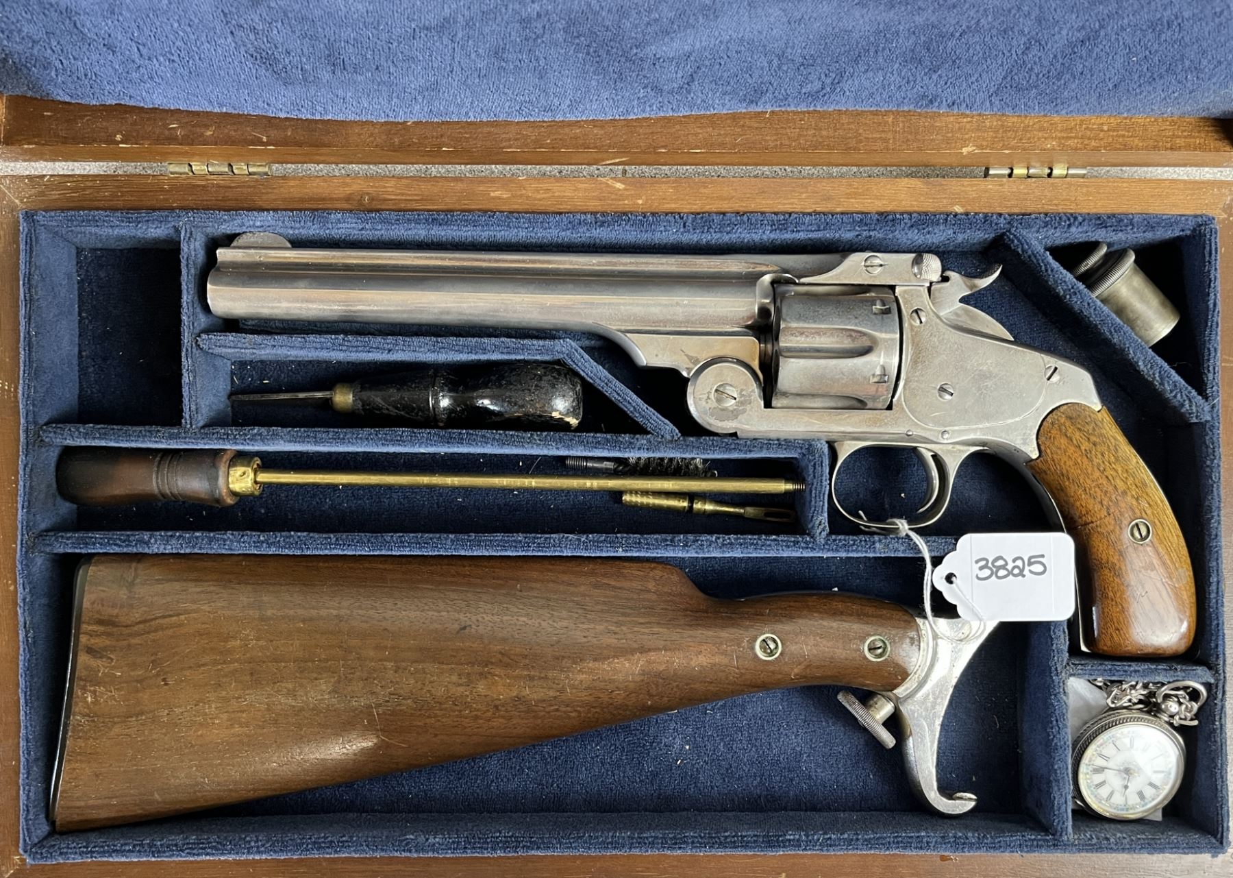 CONDITION: G OVERALL INCL BORE. TIMING & LOCKUP IS G. SPECS: 7IN BBL. EXTRAS: ANTIQUE LETTER. PERIOD WOOD CASE W/ ACC. INCL CLEANING TOOLS, POCKET WATCH & STOCK. S/N: 13069. STOCK 12259.