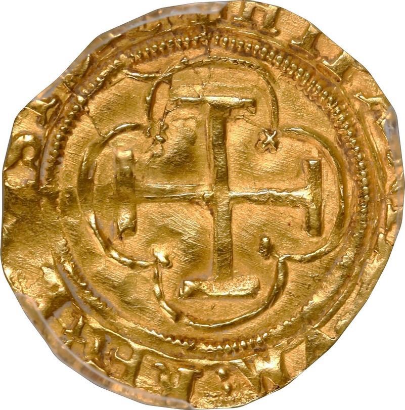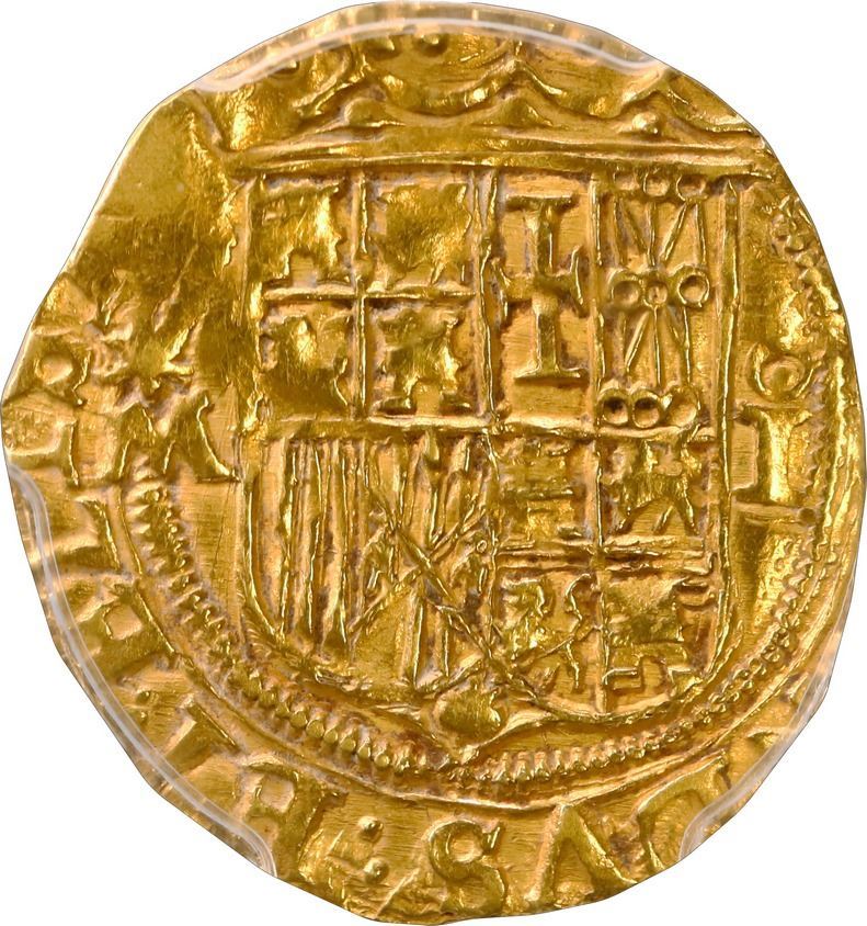 SPAIN, Toledo, gold 1 escudo, Ferdinand-Isabel, assayer *M to left, mintmark oT to right, extremely rare, PCGS MS62, finest and only example in PCGS census, Tauler Plate. Cal-2; Fr-unl. Good full shield and cross despite flat spot near edge, parts of legend visible including (FERNA)NDVS ET ELISA(BET) on obverse despite the fact that it was struck after Isabel had died in 1504, and significant as the only issue with gold cob design (shield/cross) struck in Ferdinand's name while Joanna was queen of Castile and León, presumably before the Charles-Joanna issues that followed Ferdinand's death in 1516. However, Tauler points out that this issue (of which only two are known, the present example and the Calicó plate coin) is identical to the Charles-Joanna coins, particularly the legend error HIPANIARVM (without S) on reverse. Both Tauler and Calicó list this issue under "Fernando y Juana." (Note: Label says Calicó-60 in error.). Plate Coin number 1 in Tauler's Oro Macuquino (2011).