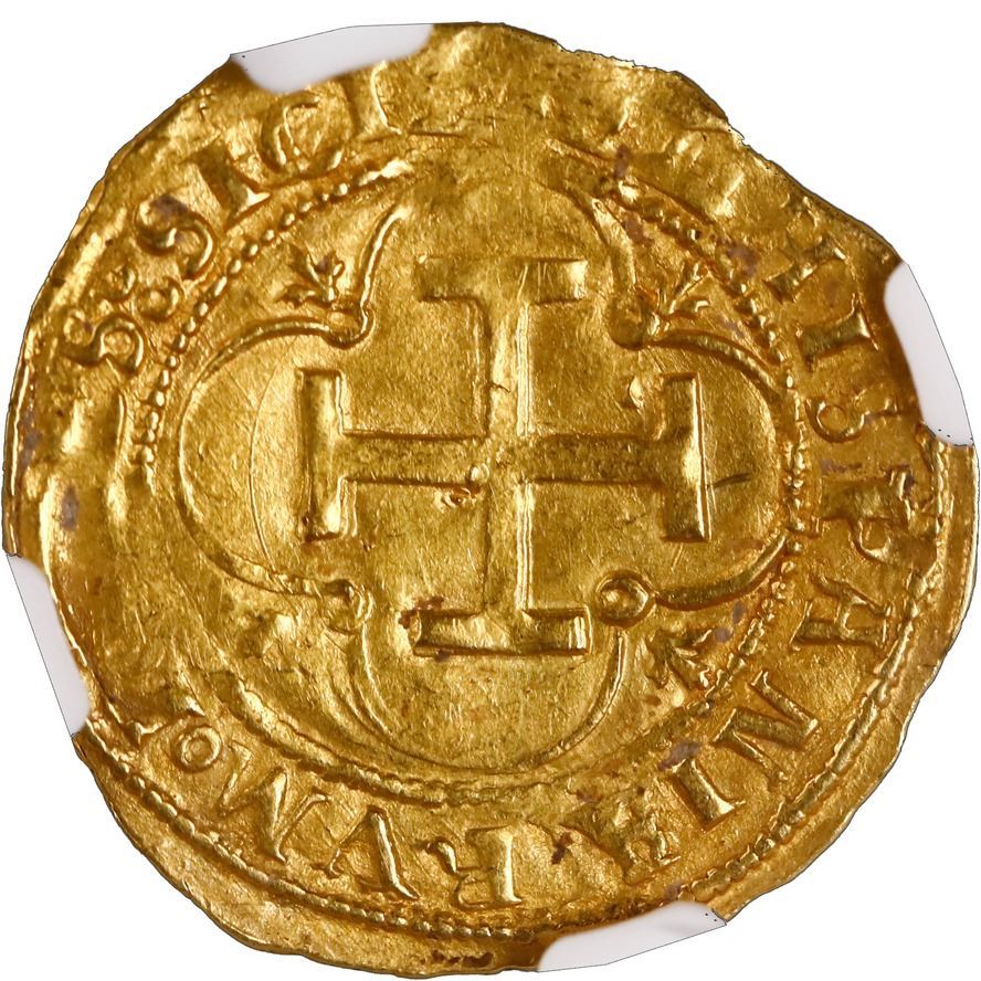 SPAIN, Seville, gold 1 escudo, Charles-Joanna, assayer * to left, mintmark S to right, NGC MS 63. Cal-197; Fr-153. 3.34 grams. Very broad flan that extends well past the full legends in places, choice full shield and cross, rich gold color, muted luster.