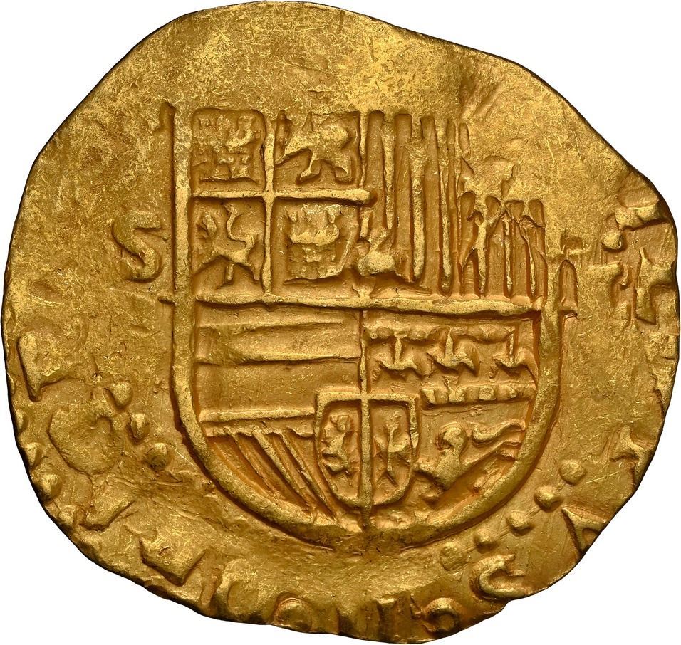 Lot 5 SPAIN, Seville, gold cob 2 escudos, Philip II, assayer Gothic D below mintmark S to left, denominati