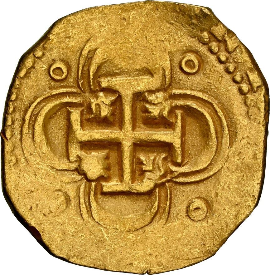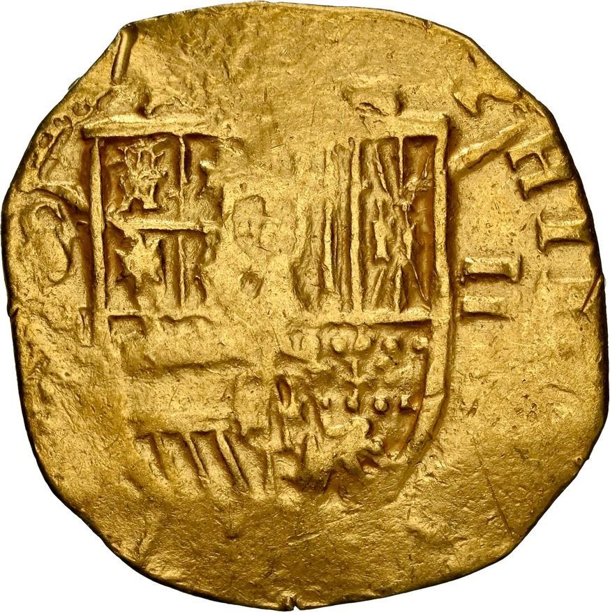 Lot 9 SPAIN, Seville, gold cob 2 escudos, Philip II or III, assayer not visible, NGC AU details / cleaned.
