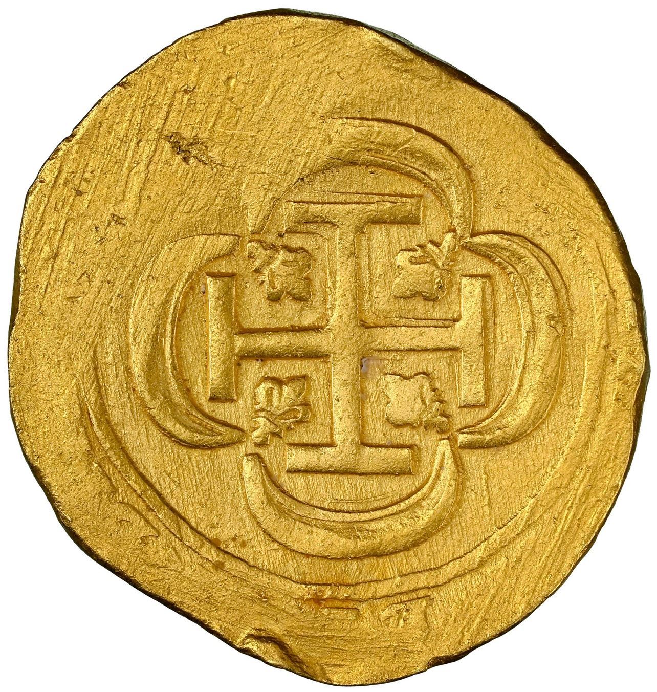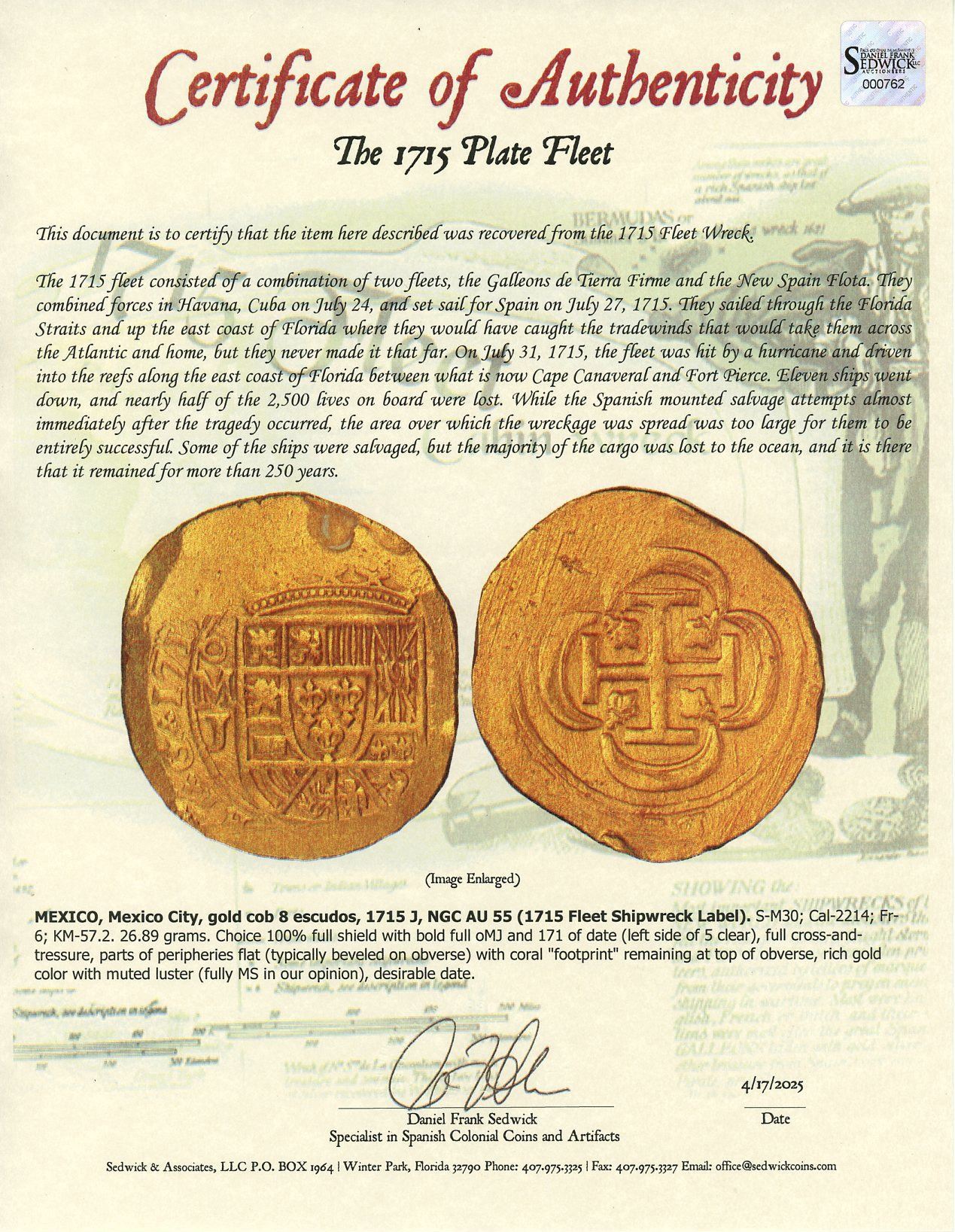 MEXICO, Mexico City, gold cob 8 escudos, 1715 J, NGC AU 55 (1715 Fleet Shipwreck Label). S-M30; Cal-2214; Fr-6; KM-57.2. 26.89 grams. Choice 100% full shield with bold full oMJ and 171 of date (left side of 5 clear), full cross-and-tressure, parts of peripheries flat (typically beveled on obverse) with coral "footprint" remaining at top of obverse, rich gold color with muted luster (fully MS in our opinion), desirable date. From the 1715 Fleet, with photo-certificate.