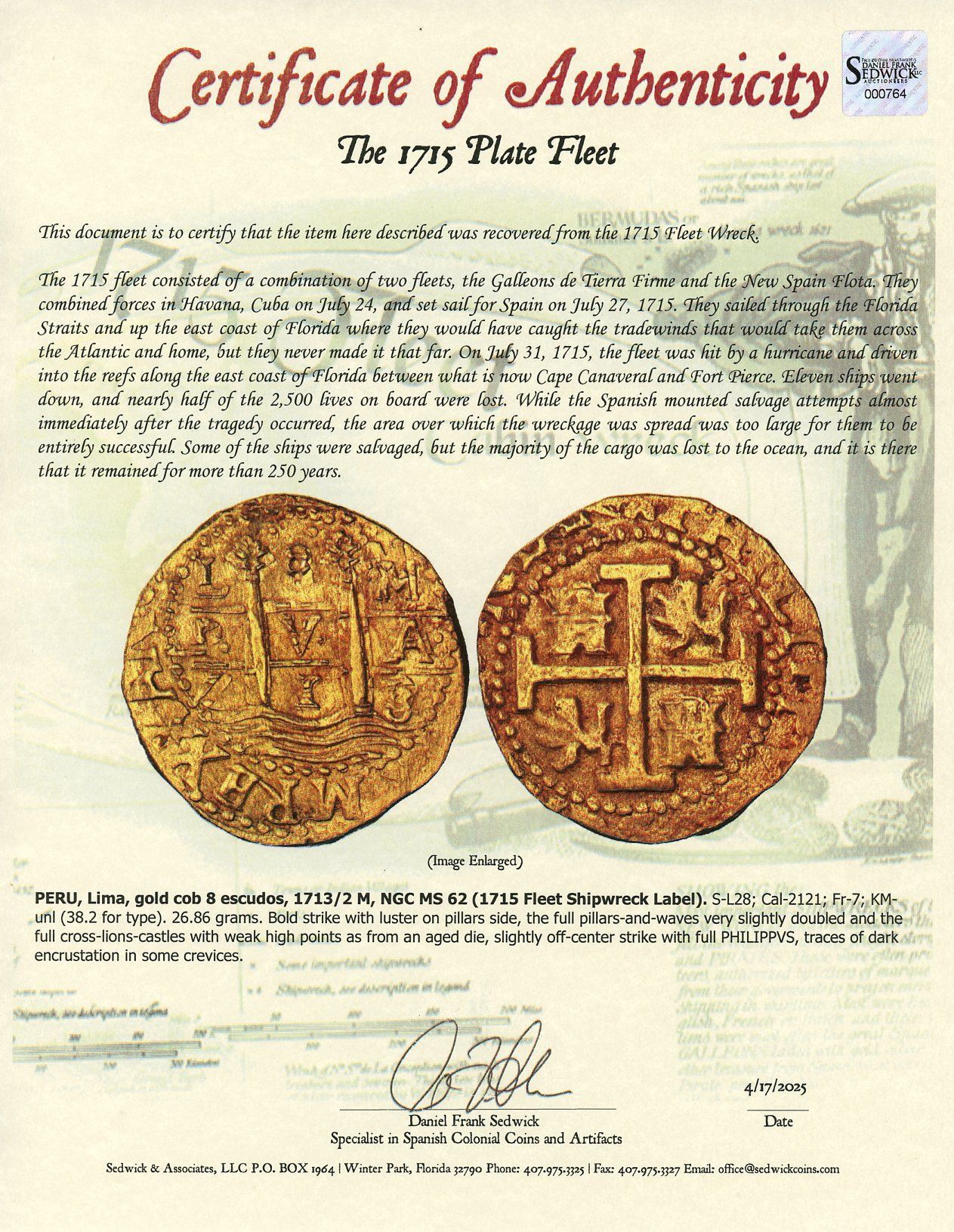 PERU, Lima, gold cob 8 escudos, 1713/2 M, NGC MS 62 (1715 Fleet Shipwreck Label). S-L28; Cal-2121; Fr-7; KM-unl (38.2 for type). 26.86 grams. Bold strike with luster on pillars side, the full pillars-and-waves very slightly doubled and the full cross-lions-castles with weak high points as from an aged die, slightly off-center strike with full PHILIPPVS, traces of dark encrustation in some crevices. From the 1715 Fleet, with photo-certificate.
