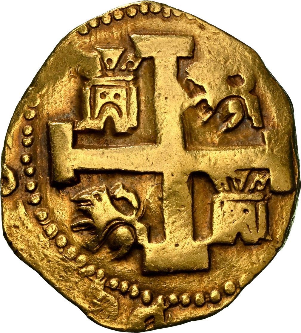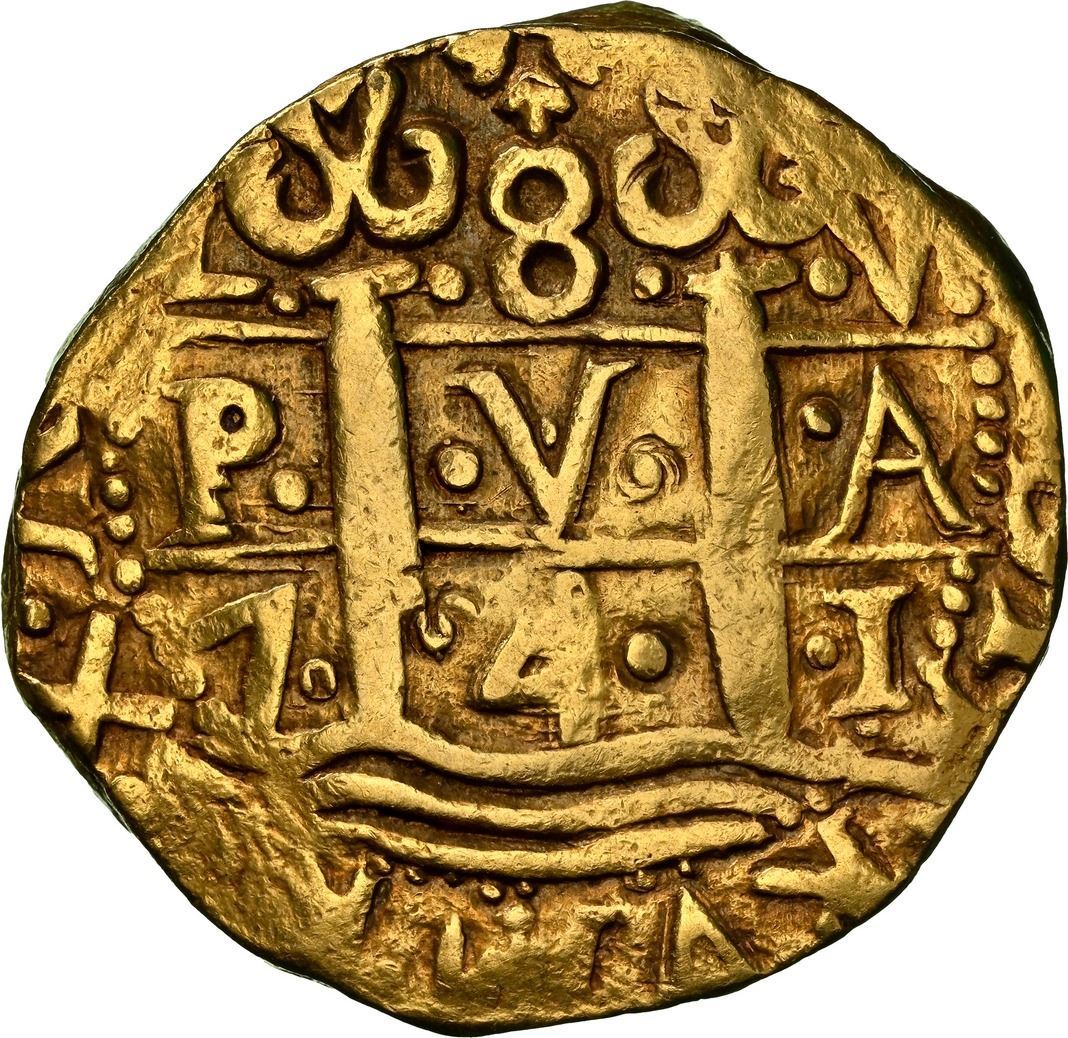 PERU, Lima, gold cob 8 escudos, 1741 V, NGC AU 53. S-L30; Cal-2159; Fr-7; KM-38.2. 27.02 grams. Round, thick, compact flan with full pillars-and-waves and cross-lions-castles, contrasting toning, just one grade lower than the finest in the NGC census (AU 55). Pedigreed to the Christie's (New York) auction of September 1989, with original lot-tag 175.