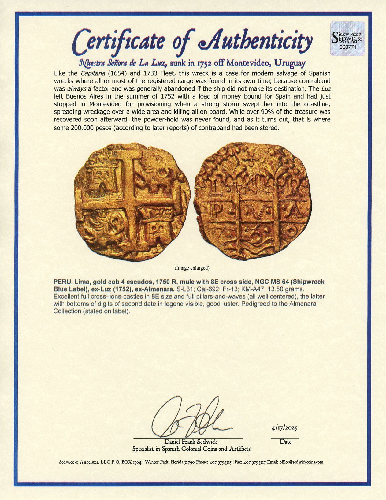 PERU, Lima, gold cob 4 escudos, 1750 R, mule with 8E cross side, NGC MS 64 (Shipwreck Blue Label), "top pop," ex-Luz (1752), ex-Almenara. S-L31; Cal-692; Fr-13; KM-A47. 13.50 grams. Excellent full cross-lions-castles in 8E size and full pillars-and-waves (all well centered), the latter with bottoms of digits of second date in legend visible, good luster, tied with one other for finest in NGC census for this variety. From the Luz (1752), with photo-certificate, pedigreed to the Almenara Collection (stated on label).