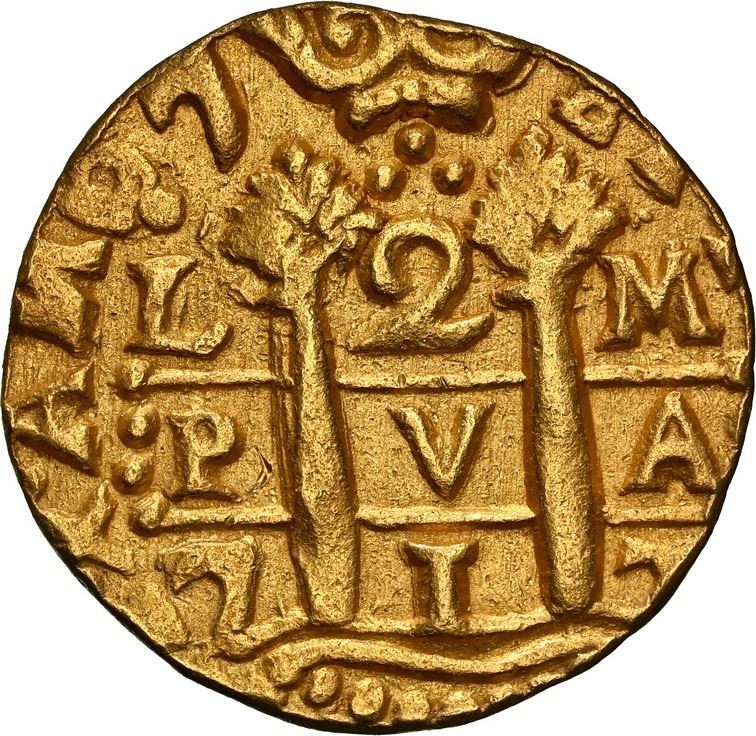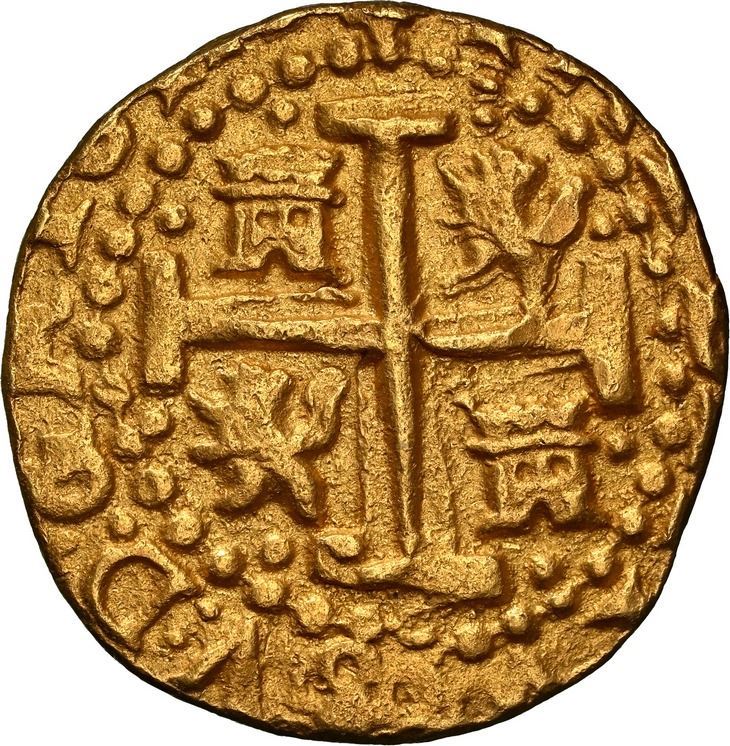 PERU, Lima, gold cob 2 escudos, 1717 M, very rare, NGC UNC details / saltwater damage, ex-Loosdrecht (1719), ex-Almenara. S-L28; Cal-unl (Type 222); Fr-9; KM-unl (36 for type). 6.54 grams. Very bold strike with satin fields, choice full pillars-and-waves and cross-lions-castles (the latter very slightly doubled), clear king's ordinal V and second date 7 (the only digit) in legend, with minor surface graininess as expected for this shipwreck (not mentioned on label). From the Loosdrecht (1719), with certificate, pedigreed to the Almenara Collection (stated on label).