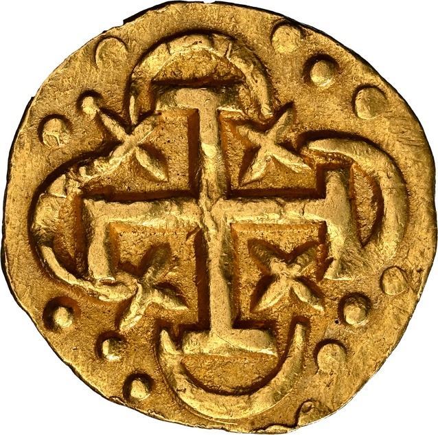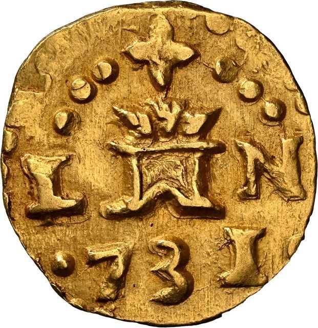 PERU, Lima, gold cob 1 escudo, 1731/0 N, extremely rare, NGC MS 61, finest and only example in NGC census, ex-Almenara. S-L29; Cal-unl (Type 197); Fr-10; KM-unl (35 for type). 3.32 grams. Choice broad flan with exceptionally bold, full, and well-centered details against satin-smooth fields, the overdate weak but certain (possibly unique, missing in Calicó and KM). Note that the teardrop ornaments seen on the previous lots have morphed into plain dots for this date. Pedigreed to the Almenara Collection (stated on label) and to the UBS auction of January 1998 (lot 2604).
