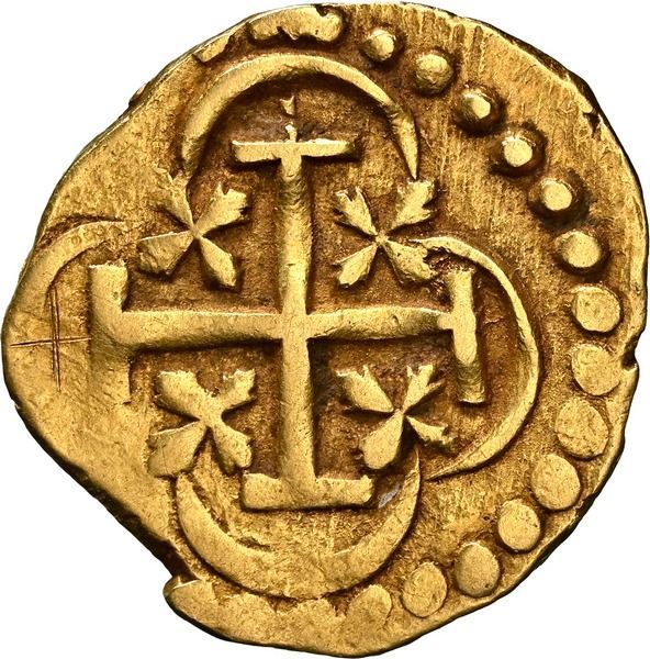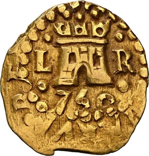 PERU, Lima, gold cob 1 escudo, 1750 R, very rare, NGC AU 55, ex-Almenara. S-L31; Cal-597; Fr-15; KM-45. 3.34 grams. Bold full cross and castle with contrasting toning, slightly doubled date (last date of issue) but very bold mintmark and assayer creating a fun coincidence of L to left and R to right, also with (IND)IARVM REX visible in castle-side legend, in fact the only date in the Peruvian cob 1E series with any legend, other examples of which have different parts of the legend visible and make it clear that the cross side still had no legend save for a large + at the top of cross side, the castle-side legend apparently enabled by shrinking the diameter of the dot-border surrounding the interior. Pedigreed to the Almenara Collection (stated on label).