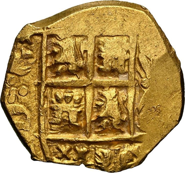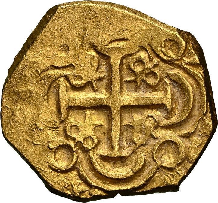 COLOMBIA, Bogotá, gold cob 2 escudos, Charles II posthumous, no assayer (Arce), NGC MS 62 (1715 Fleet Shipwreck Label). Restrepo-M66.32; S-B24; Cal-Type 242 (under Ph. V); Fr-4a; KM-14.2. 6.70 grams. Good full cross, slightly off-center shield with upright lions in transposed quadrants, traces of coral in crevices, muted luster. From the 1715 Fleet.