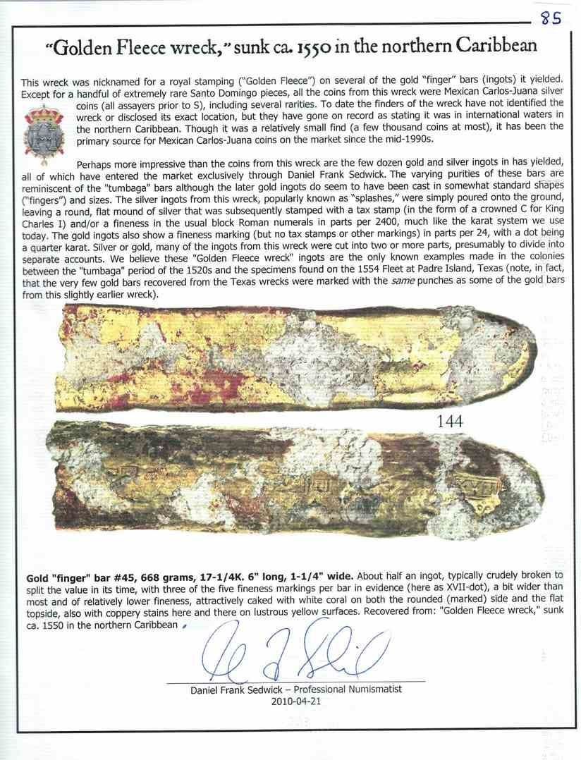 Gold "finger" bar, 668 grams, marked with fineness XVII• (17¼K), ex-"Golden Fleece wreck" (ca. 1550). 6" x 1½" x ½". Impressively encrusted and somewhat wide for a "finger" bar (the typical gold ingot of its time), about half of the original with one end showing the break and the other a naturally blunt point where the molten metal stopped flowing, with three fineness markings of XVII• on the rounded bottom, attractively caked with white coral on both sides, also with coppery stains here and there on lustrous bright-yellow surfaces. From the "Golden Fleece wreck" (ca. 1550), pedigreed to Sedwick Auction 7, with original lot-tag 144 and photo-certificate. Note: Melt value with spot gold at $3400/oz is about $52,500.