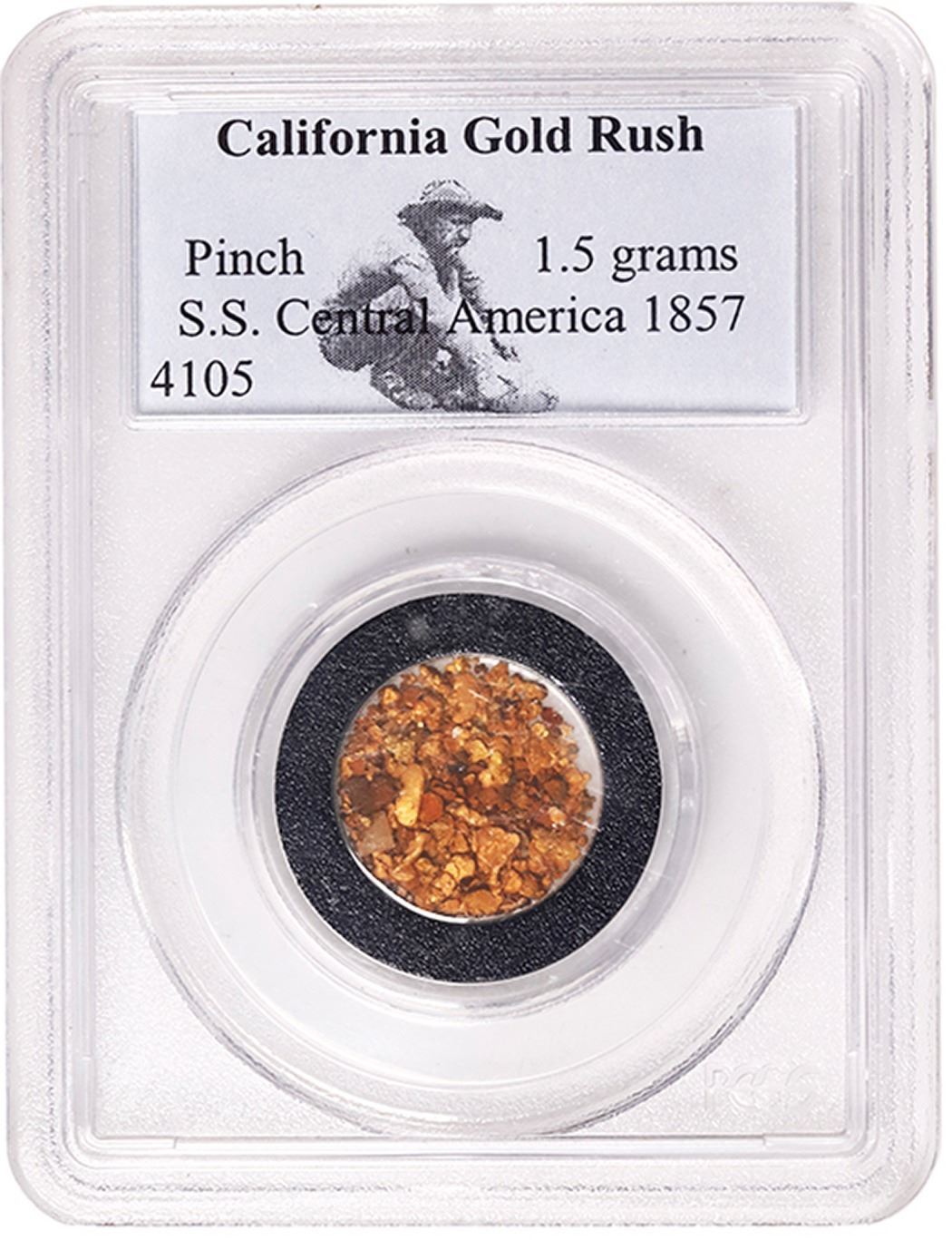 Pinch of California gold flakes, 1.5 grams, ex-SS Central America (1857). A typical Collectors Universe slab (label number 4105) housing a "pinch" of hundreds of small pieces of natural gold, as found in rivers and streams in the California Gold Rush and lost on this famous wreck, with lots of shapes and colors, none bigger than about 3/16" but no dust. From the SS Central America (1857), as stated on label.