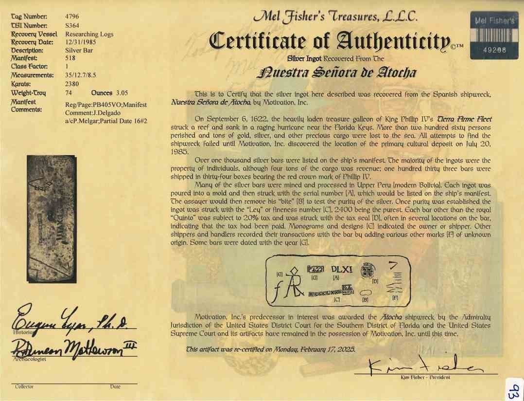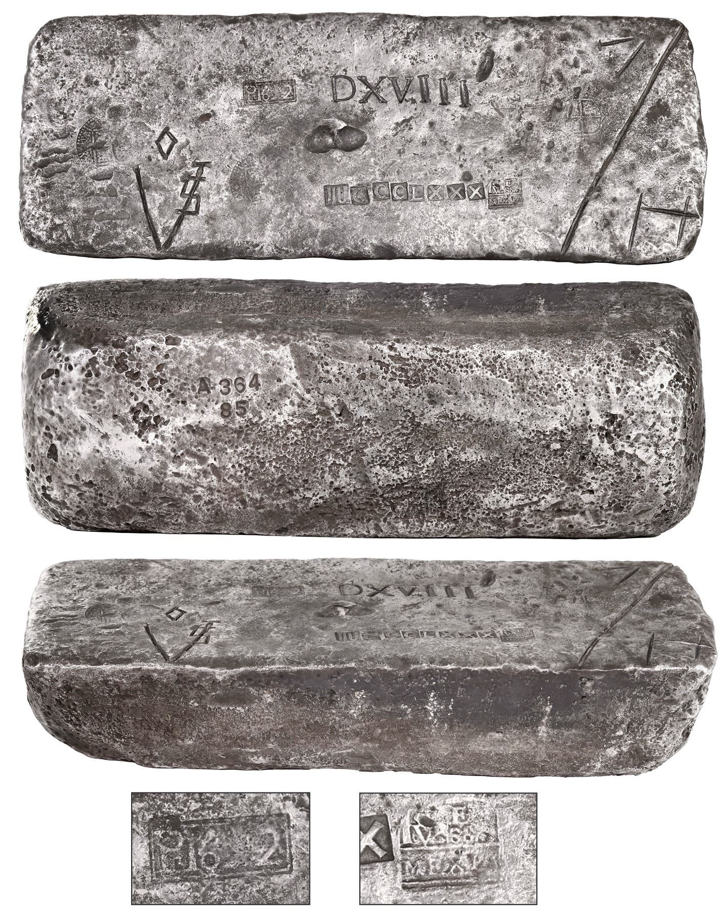 Large silver ingot 364 from Potosí, Class Factor 1.0, 78 lb 8 oz troy, marked with mint/date Po1621, fineness IUU CCC L XXX (2380/2400) and assayer Mexía cartouche, owner/shipper marks, tax stamps, and manifest number DXVIII (518), ex-Atocha (1622). Another premium ingot with very smooth top surface showing rather bold fineness, manifest. and smallish owner "sigla," the double-scoop assayer's "bite" in center also rather prominent, but also with three discernible circular coat-of-arms tax stamps, V for silvermaster de Vreder, and clear Po1622 cartouche, in addition to a very clear assayer's cartouche following the fineness, and lastly a deep diagonal slash believed to indicate where an amount was to be cut off at the destination to pay the "avería" (defense tax), according to the book Spanish Treasure Bars, by Craig and Richards (2003). From the Atocha (1622), with original Fisher photo-certificate 85A-S364.