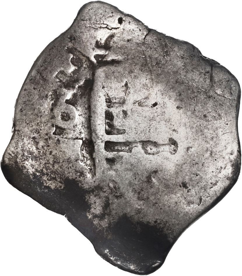 MEXICO, Mexico City, cob 1 real, 1634 (P), very rare. S-M19; KM-unl (28 for type); Cal-unl (Type 199). 3.49 grams. Odd-shaped flan (squarish but with two rounded sides) with nearly full well-centered cross, clear bottom half of 34 of date above mintmark oM, lightly toned with some dark areas near edge, VG/AVF overall.
