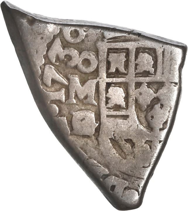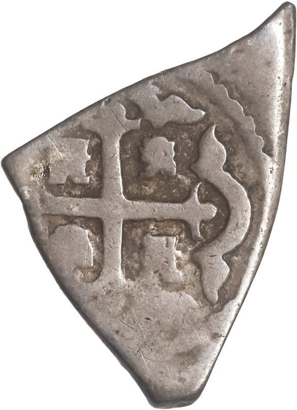 MEXICO, Mexico City, cob 1 real, 1730 G/R, rare, ex-Hubbard. S-M25; KM-unl (30 for type); Cal-unl (Type 77). 3.24 grams. Perfectly triangular flan with 100% full and bold 1730 date and G/R assayer, most of shield and nearly full cross, richly toned Fine. Pedigreed to the Clyde Hubbard Collection, with his tag.