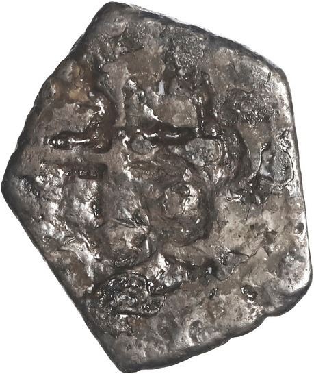 MEXICO, Mexico City, cob ½ real, 1733 (F), rare, ex-Hubbard. S-M26; KM-24a; Cal-244. 1.09 grams. Small, pentagonal flan with full date and oM mintmark, messy full cross with golden residue on that side, otherwise toned AVF. Pedigreed to the Clyde Hubbard Collection, with his tag.