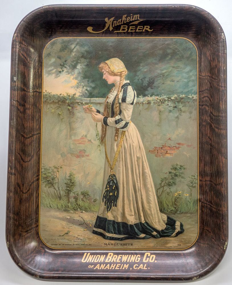 Rectangular. Brown, made to look like wood. Gold lettering: "Anaheim Beer/ Union Brewing Co. of Anaheim, Cal." The scene: an elegantly dressed woman with long, braided hair plucks flower petals in a garden setting. Titled "Marguerite" by W.H. McEntee. Copyright 1911 by The American Art Works, Coshocton, Ohio. Scratches around rim. Measures 13 1/4"x 10 1/2." Burt Collection