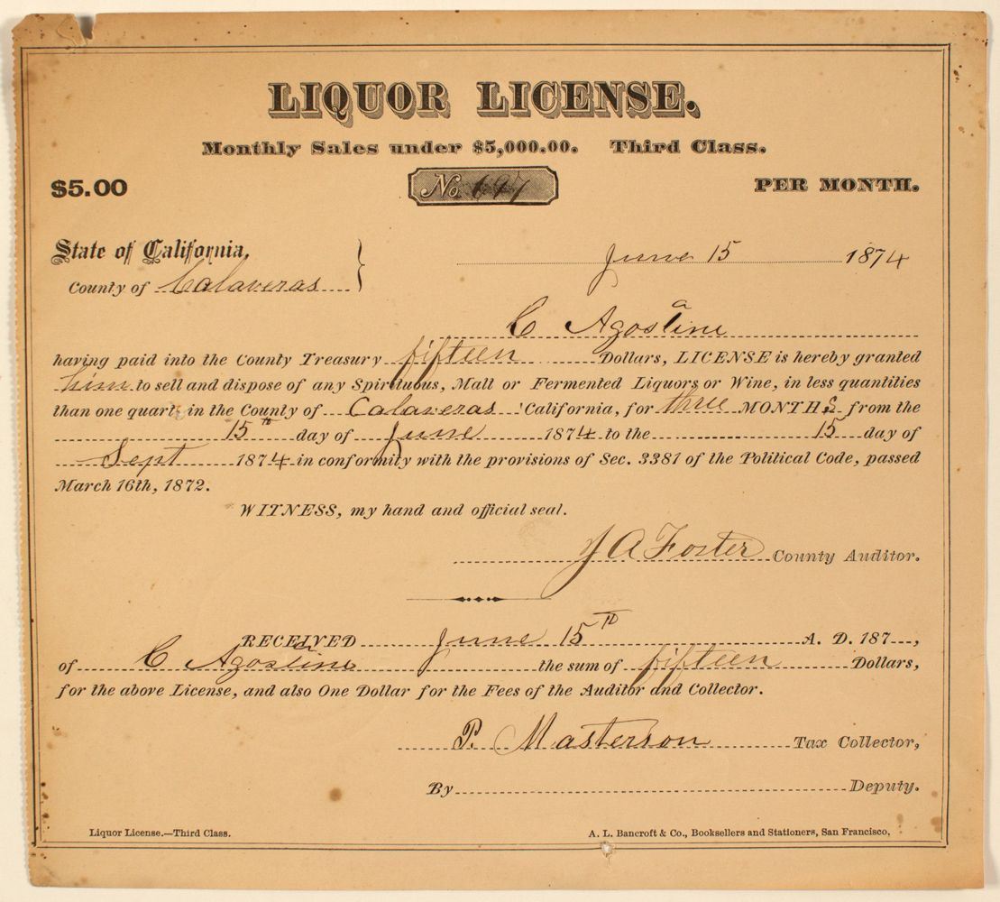 Liquor License, Third Class, No. 697. Issued June 15, 1874 to C. Agostini. $15 for three months. Soiling, foxing, a pin hole and a small tear. C(yprien Joseph) Agostini (1828-1904) was born in Corsica. According to the 1880 census, Agostini was a store-keeper in San Andreas, Calaveras County, California. Measures 7.5" x 8.5"