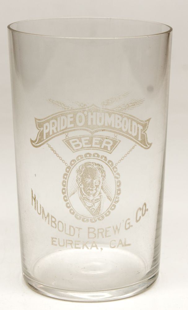 We have never heard of another one of these! Etched. Little over 3 1/2". Etching of a gentleman on the middle of the glass. "Pride O' Humboldt / Beer / Humboldt Brew & Co. / Eureka, Cal." Burt Collection