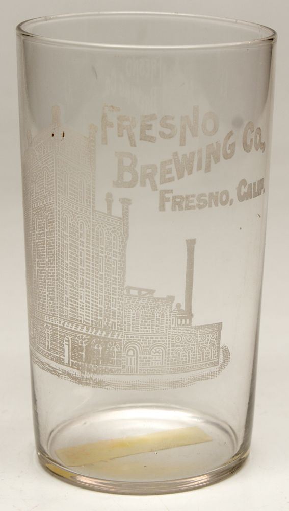 3 1/2". Etched. Shows the brewery in etching. "Fresno Brewing Co. / Fresno, Calif." Burt Collection