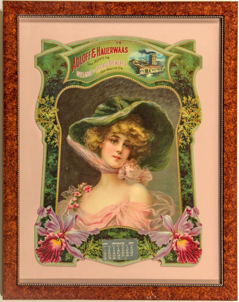 Sole agents for Wieland's and Chicago Breweries, Los Angeles, Cal. A floral, green border surrounds a blonde-haired, blue-eyed young woman in a pink dress and green hat. There is also a small vignette of the Adolff & Hauerwaas waterfront factory. The calendar is bottom center. From Printing Copyright 1904. Wolf & Co., Phila. die cut measures 13" x 17 1/2" in a 18" x 23" frame. Burt Collection