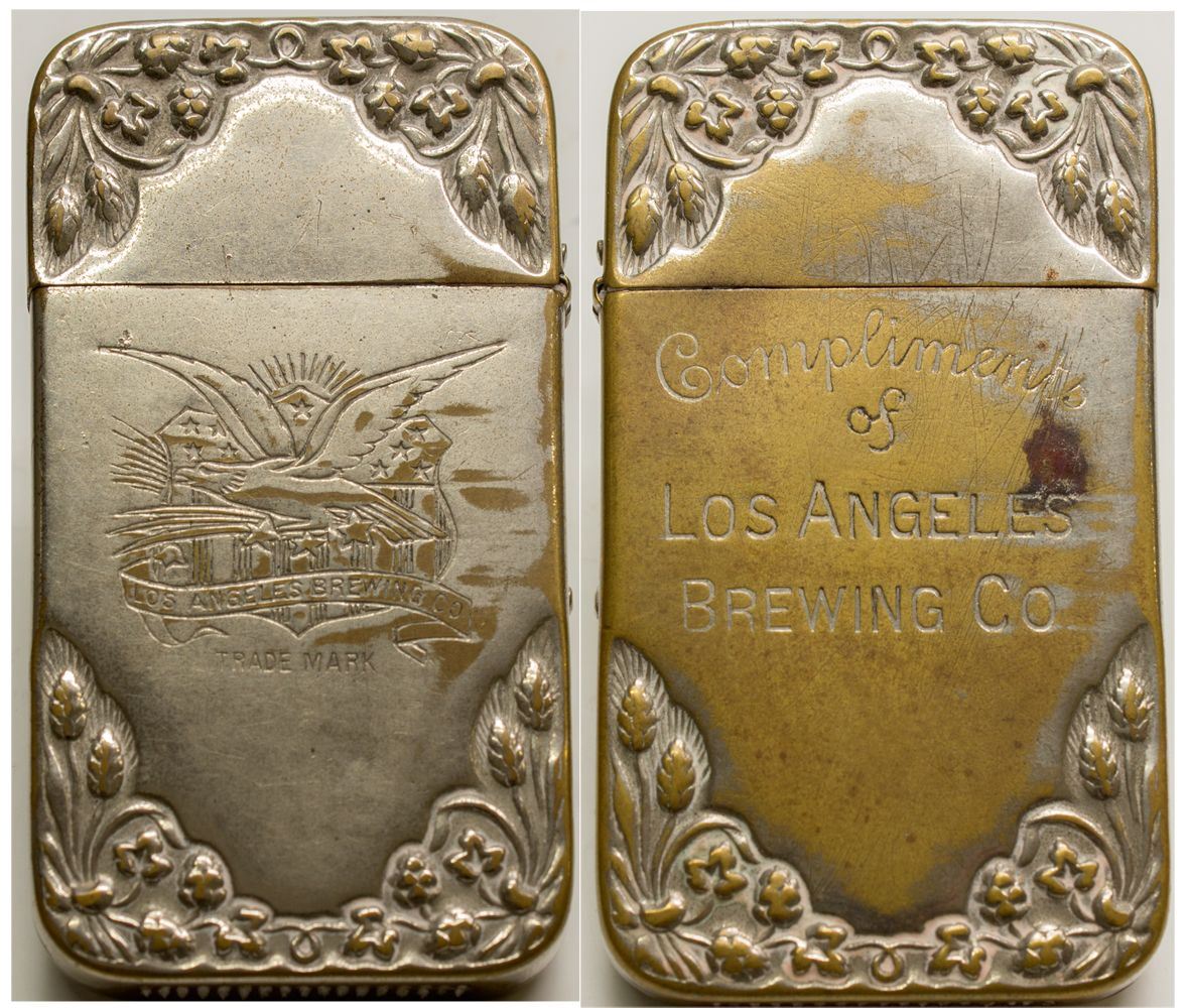 Engraved. "Compliments of Los Angeles Brewing Co." on one side and a patriotic eagle flying over trademark on other.