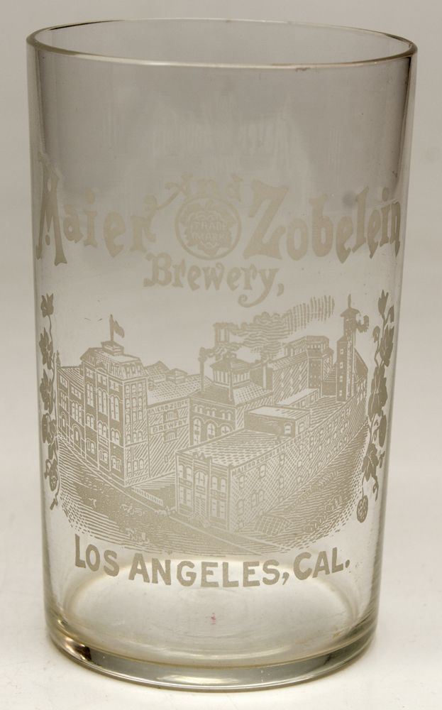 Etched "Maier & Zobelein / Brewery / Los Angeles, Cal." Magnificent etching of brewery!!!. 3 3/4". Burt Collection